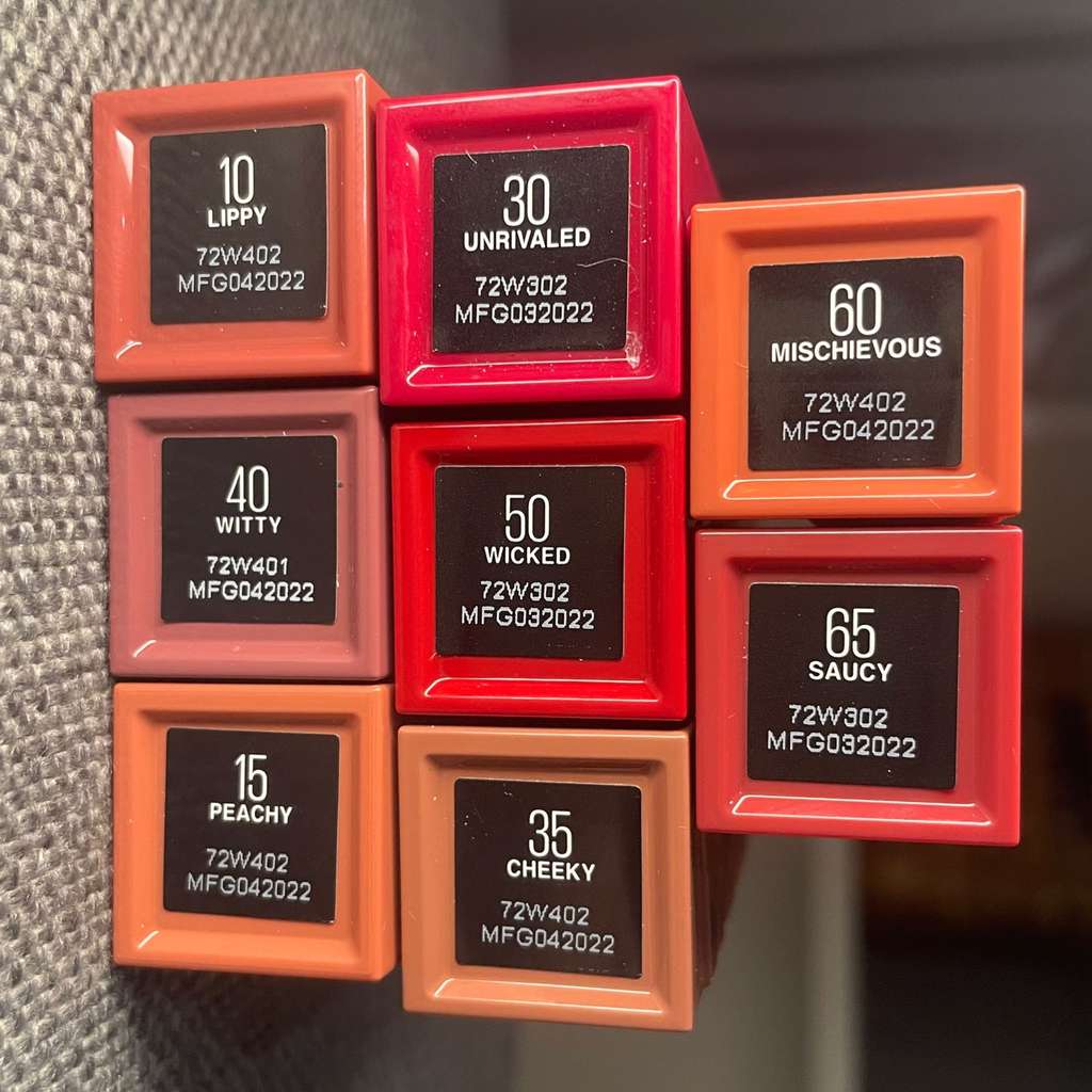Terdapat 8 shades dari koleksi lipstik ini. Mulai dari 30 Unrivaled, 35 Cheeky, 10 Lippy, 65 Saucy, 40 Witty, 50 Wicked, 60 Mischievous, dan 15 Peachy.