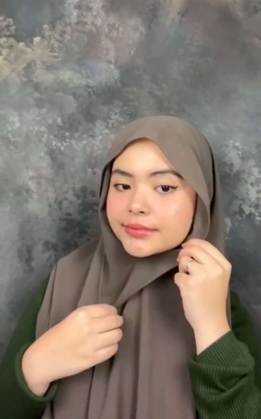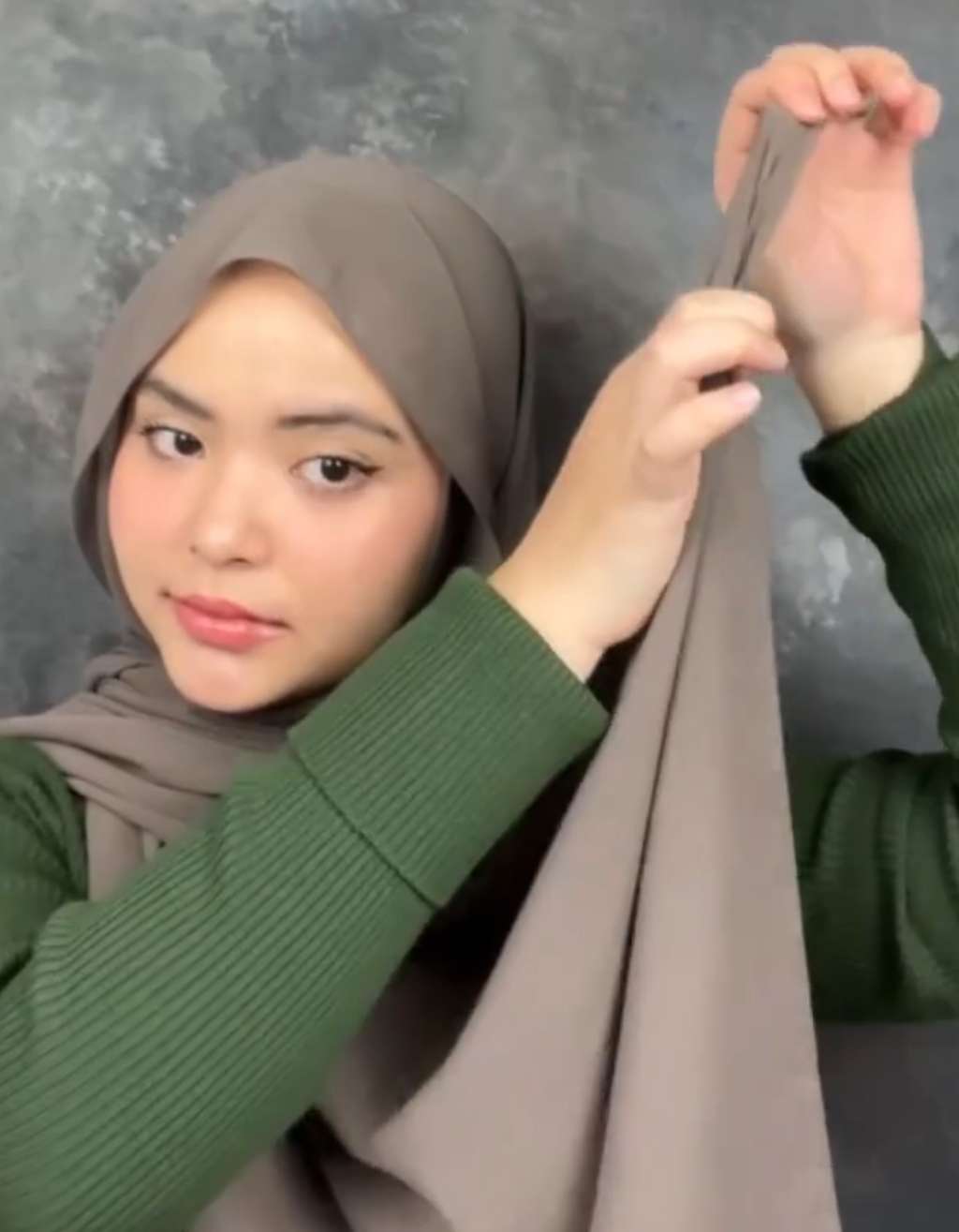 Siapkan kerudung pashmina kamu dan langsung ikuti cara dari Gisella berikut. Pertama-tama kenakan dulu kerudung pashmina di atas kepala, dengan satu sisi lebih panjang dari sisi satunya. Setelah itu bingkai wajah kamu, namun jangan langsung dikunci dengan jarum pentul.
