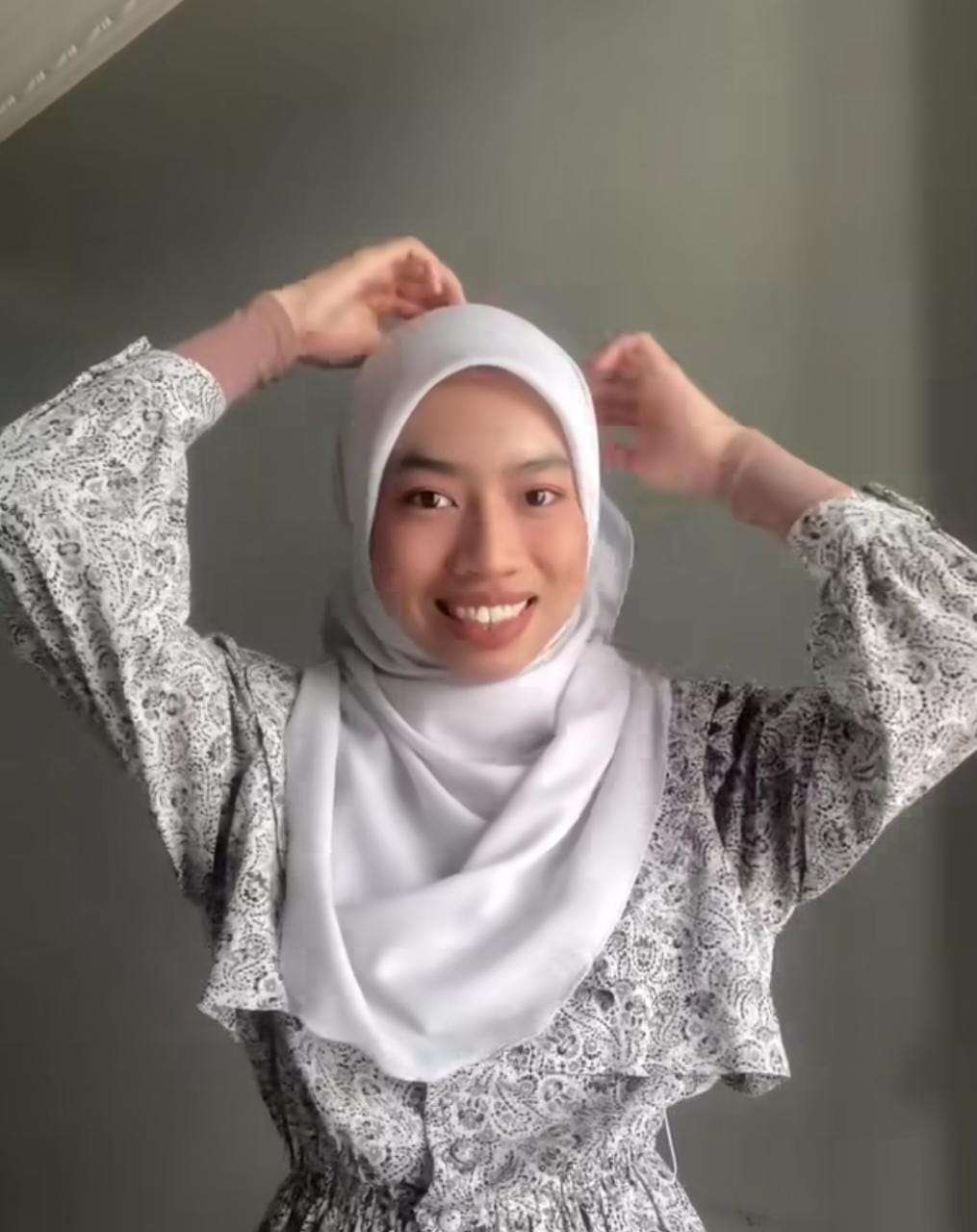 Sahabat Dream bisa meniru tutorial dari hijab content creator @thescialle. Ia memperagakan cara pakai kerudung segi empat berwarna putih, dengan tampilan flowy.