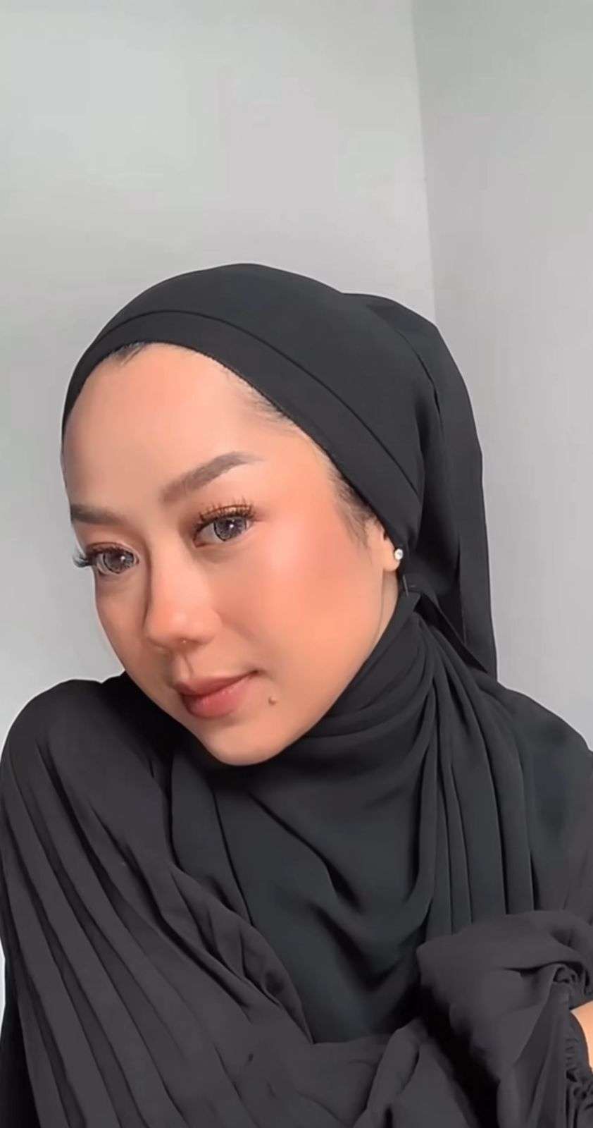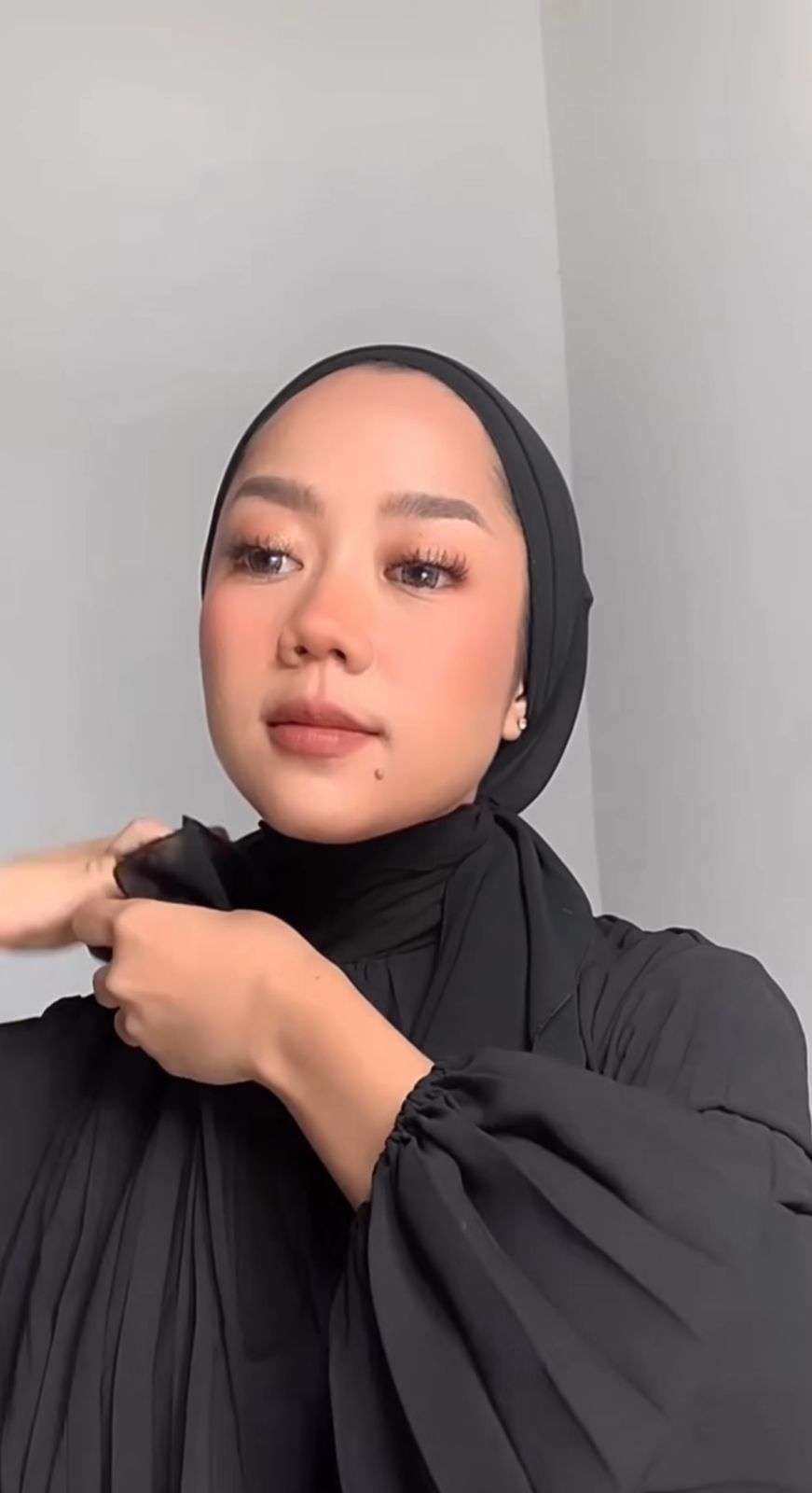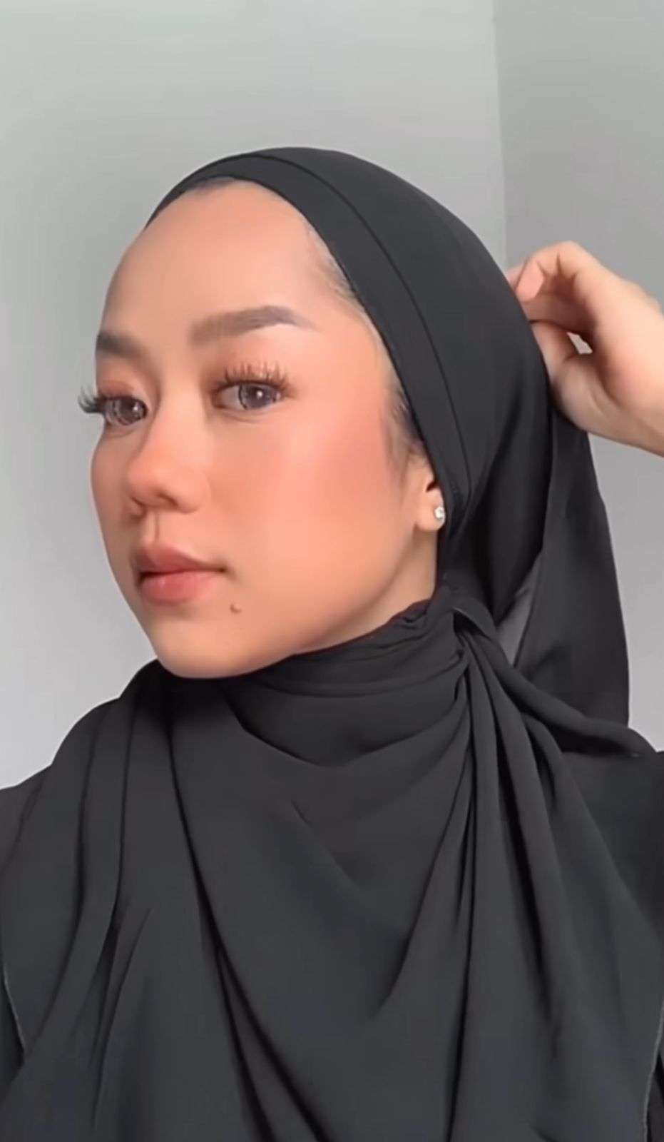 Selanjutnya, Cheryl membuat sebuah lipatan kecil di atas kepalanya. Cara ini untuk memberi detail di tampilan kerudungnya.