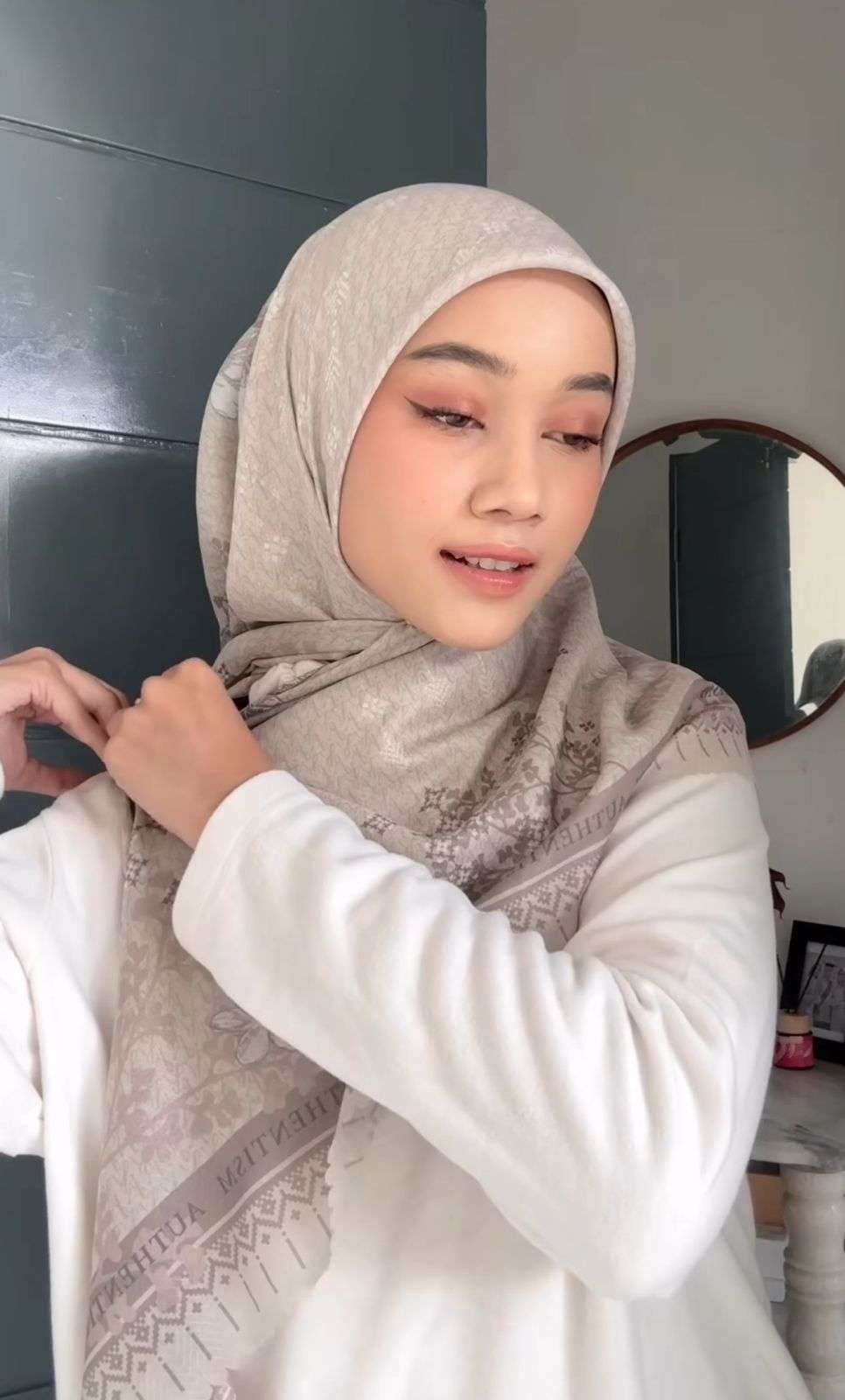 Jika kamu menggunakan kerudung segi empat motif, kamu bisa coba styling dengan cara yang simpel. Trik styling yang dibagikan Ravira Naila Khansa yang merupakan konten kreator pemilik akun Instagram @ravalsaa.