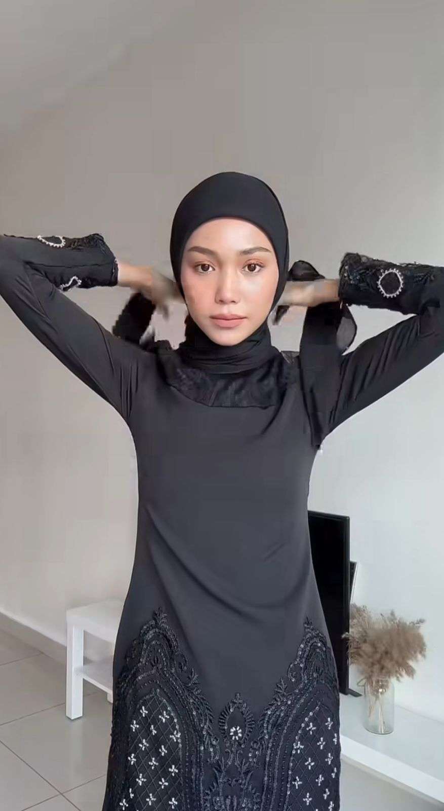 Sisi panjang yang dililitkan tadi dikunci dengan jarum pentul pada bagian atas kepalanya. Tentunya agar kerudung tetap rapi dan tidak licin.