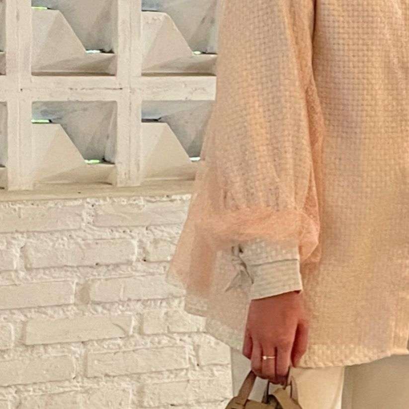 Pada bagian lengannya, lapisan tile pada luar kemeja ini memiliki potongan balon dengan ujung pita. Sehingga penampilannya bertambah manis.