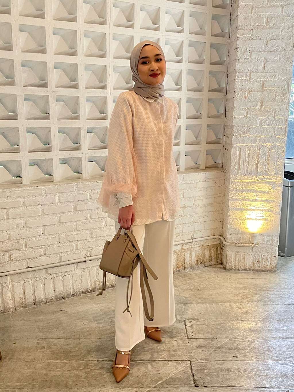 Dia memadukan atasan itu dengan celana bahan yang juga simpel berwarna putih dengan potongan lurus.