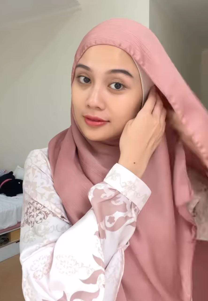 Pertama, ia sudah memasang ciput ninja di kepala. Setelah itu, ia memakai pashmina silk dengan kedua sisi sama panjang.