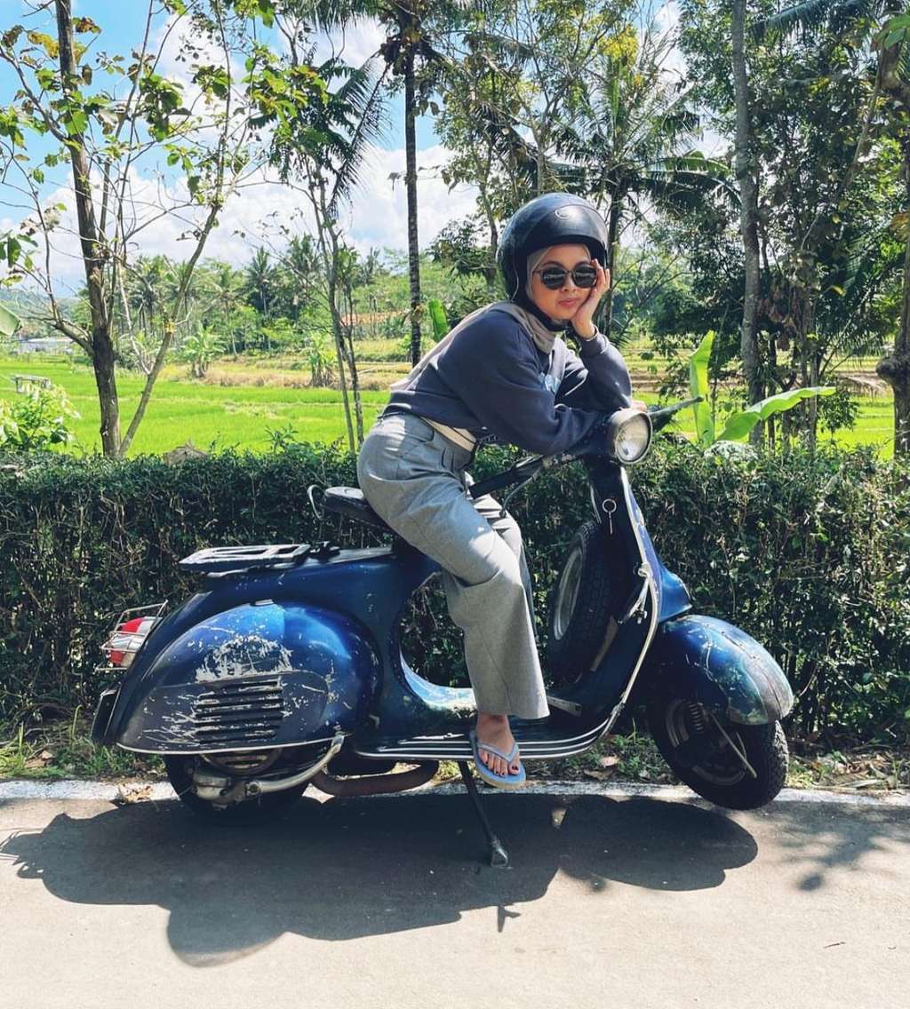 Tampil santai saat naik motor, Neneng memilih pakai atasan berupa sweater warna dark blue. Walaupun atasannya santai, celana yang dipilih adalah celana bahan berwarna abu-abu.
