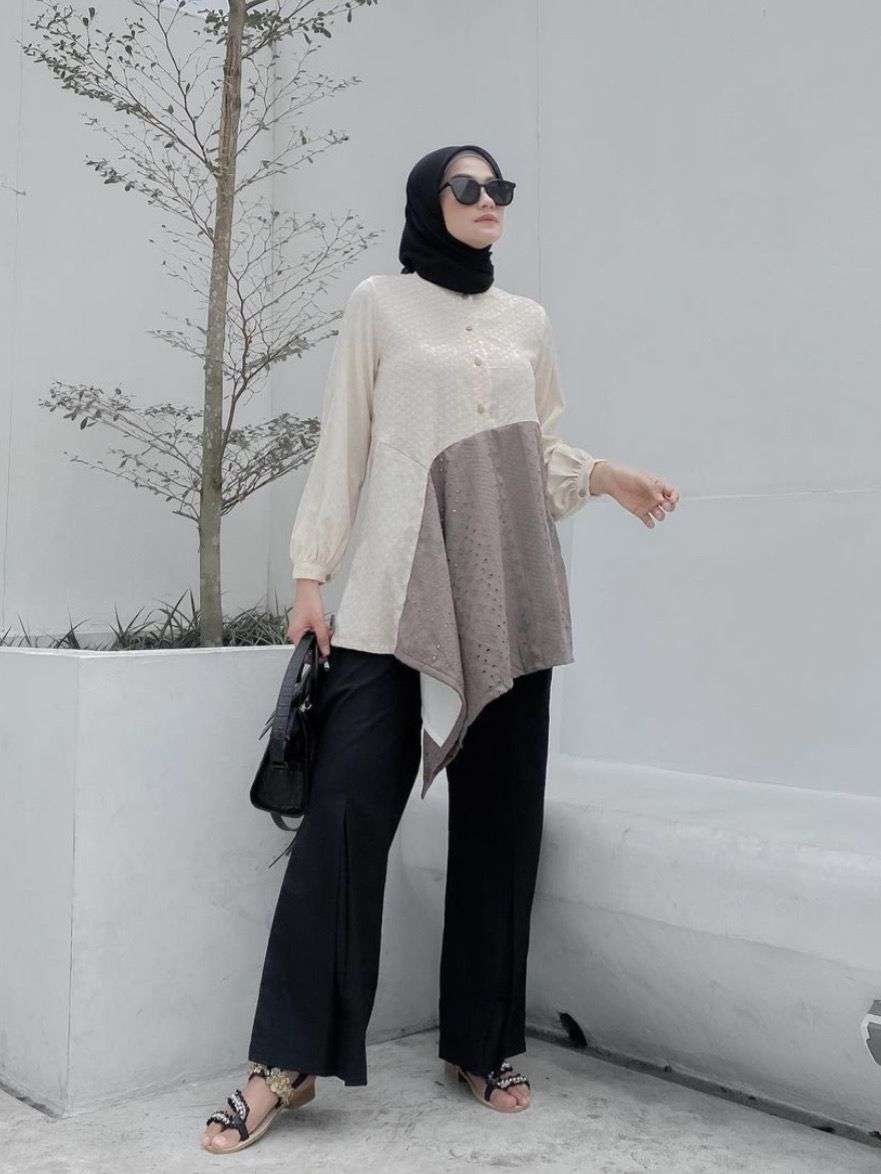 Dalam salah satu unggahannya, perempuan bernama Anggita Kusuma itu memilih atasan tunik dengan model asimetris dengan perpaduan dua warna, abu-abu dan putih. Atasan ini menjadi statement yang kuat untuk outfitnya secara keseluruhan.