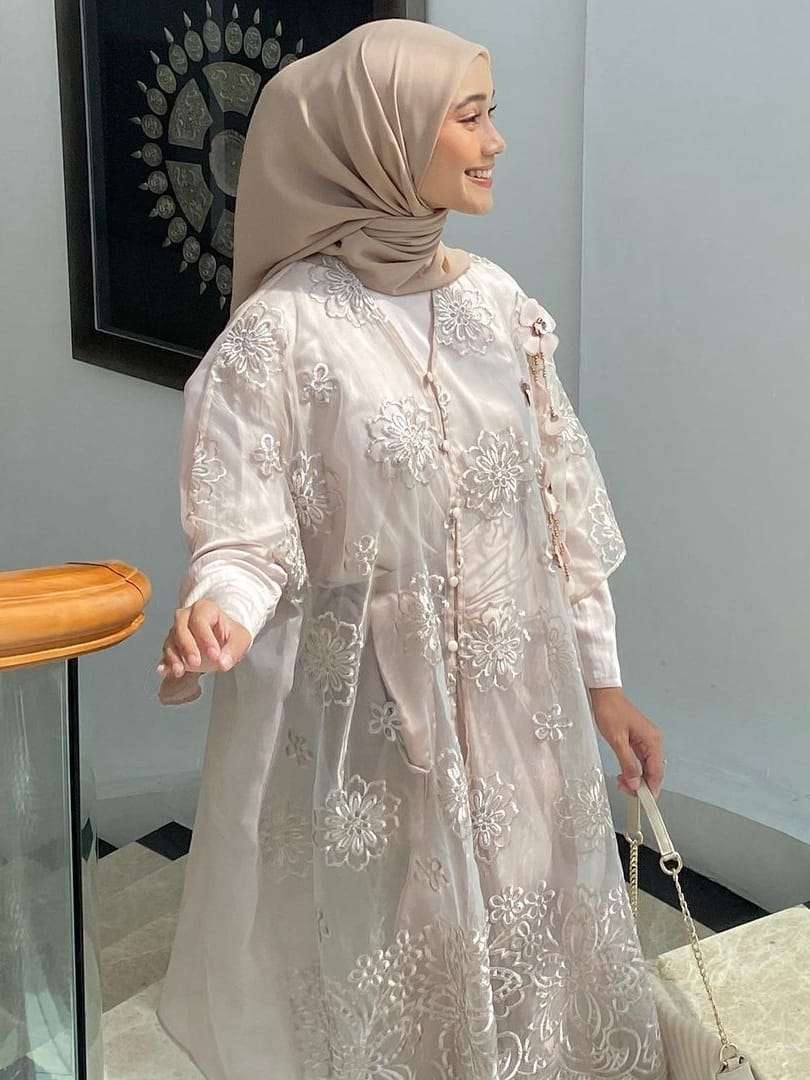 Menggunakan blouse warna krem sebagai inner, dengan menambahkan outer brukat transparan warna senada. Kesan glamour terlihat dari tampilannya kali ini.
