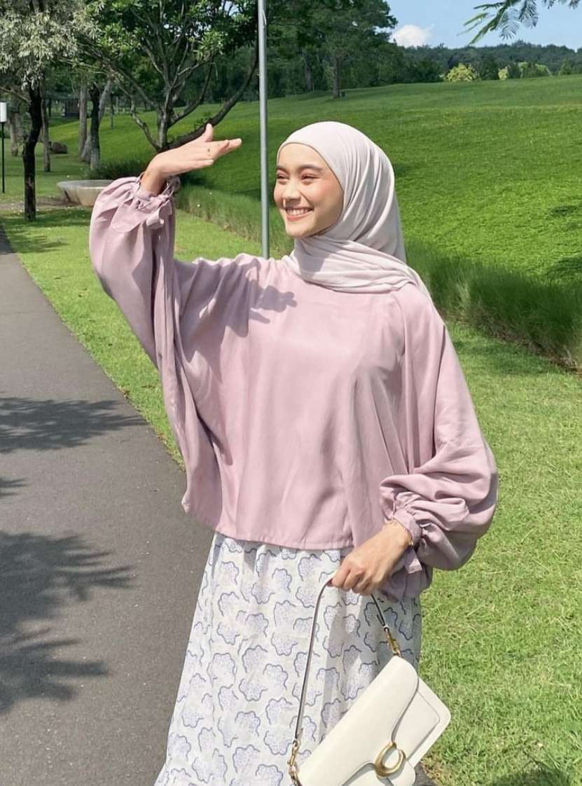 Memakai kerudung berwarna dusty pink, tampilannya jadi lebih cerah. Outfit ini bisa dipakai untuk acara formal maupun non formal.