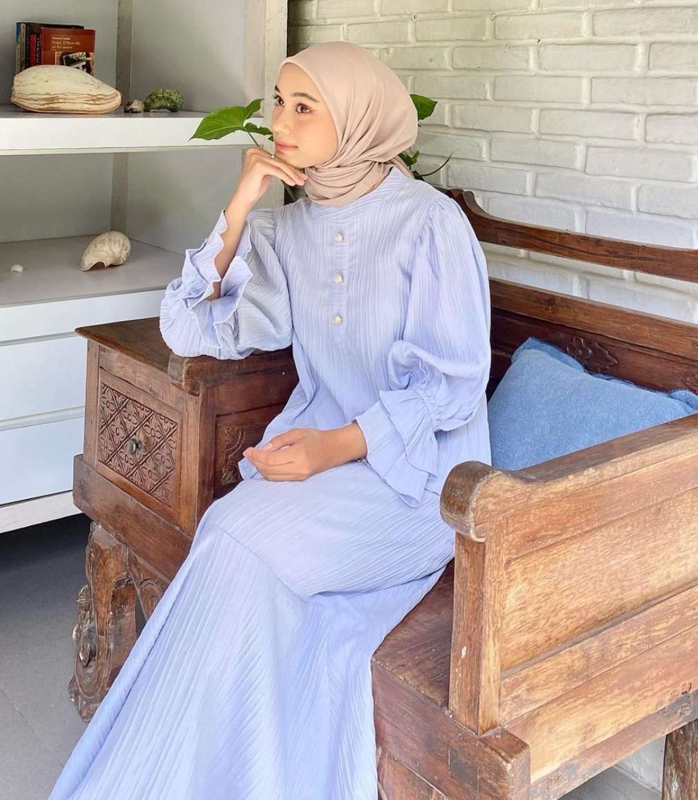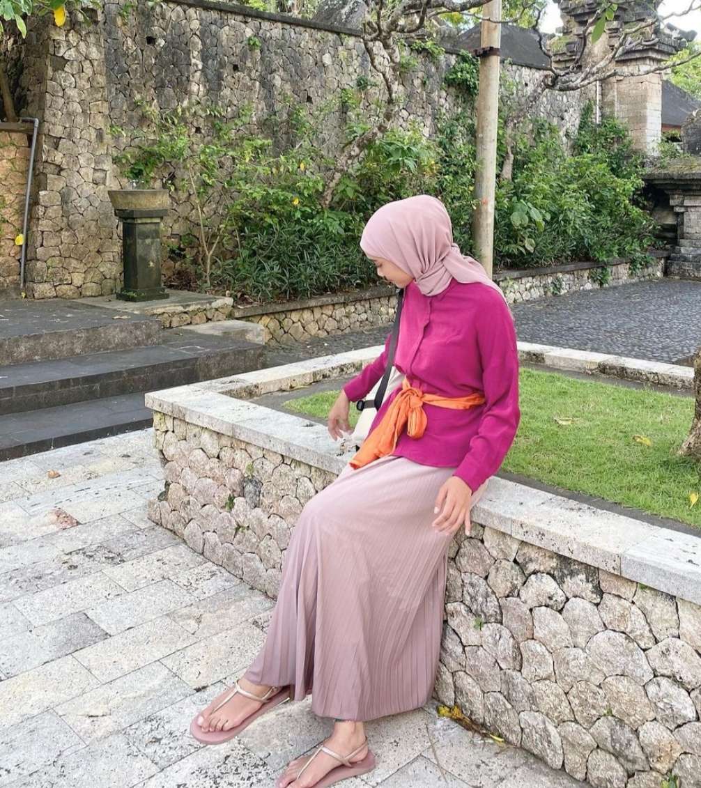 Rok plisket warna dusty pink digunakan oleh Ravira kali ini, flowy saat tertiup angin. Kerudung segitiga yang diikatkan di bagian lehernya, memiliki warna senada dengan roknya.