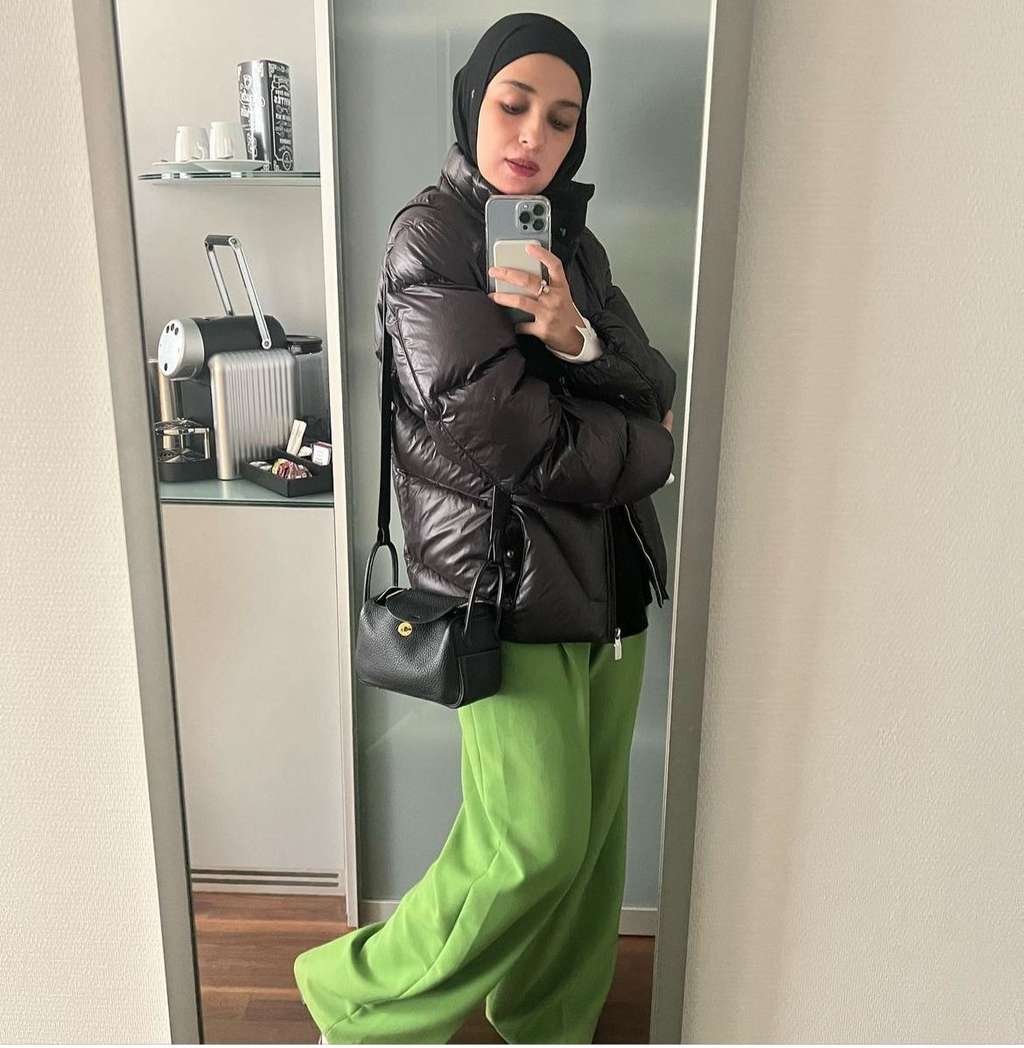 Kerudung pashmina hitam, dan jaket winter milik Teuku Wisnu dipakai Shireen, bersama dengan celana wide leg berwarna hijau daun. Celana dengan warna terang ini berhasil membuat tampilan Shireen jadi lebih cantik.