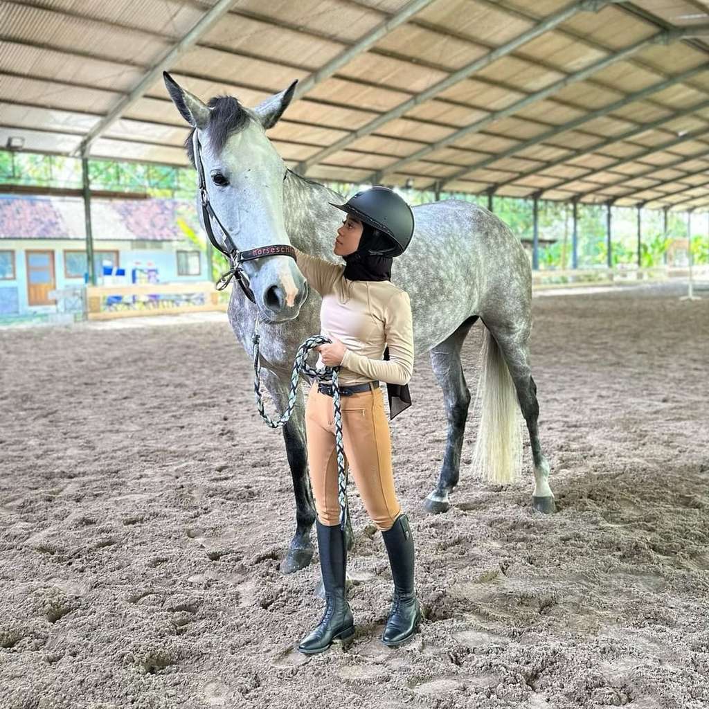 Istri Rizky Billar tak mau ketinggalan untuk mencoba berkuda. Lesti untuk pertama kalinya mencoba berkuda tampil dengan outfit bernuansa creme.