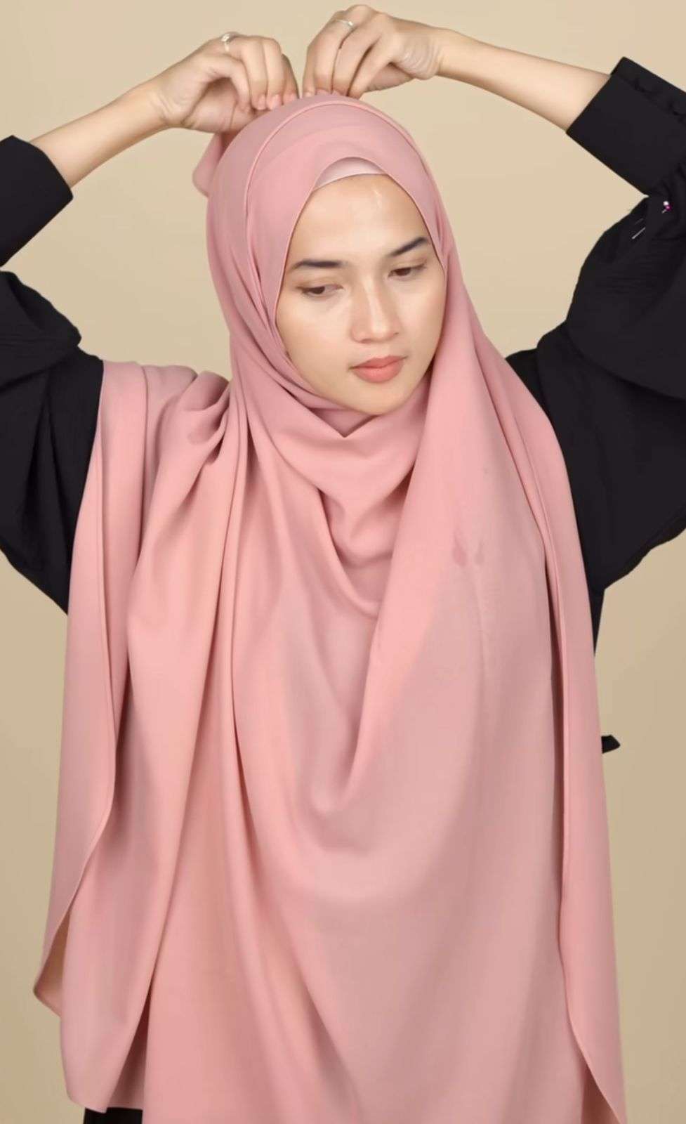 Sisi hijabnya bisa dibawa ke atas kepala. Amankan dengan pin pada bagian cepolan. Rapikan sisanya ke bagian belakang tubuh.