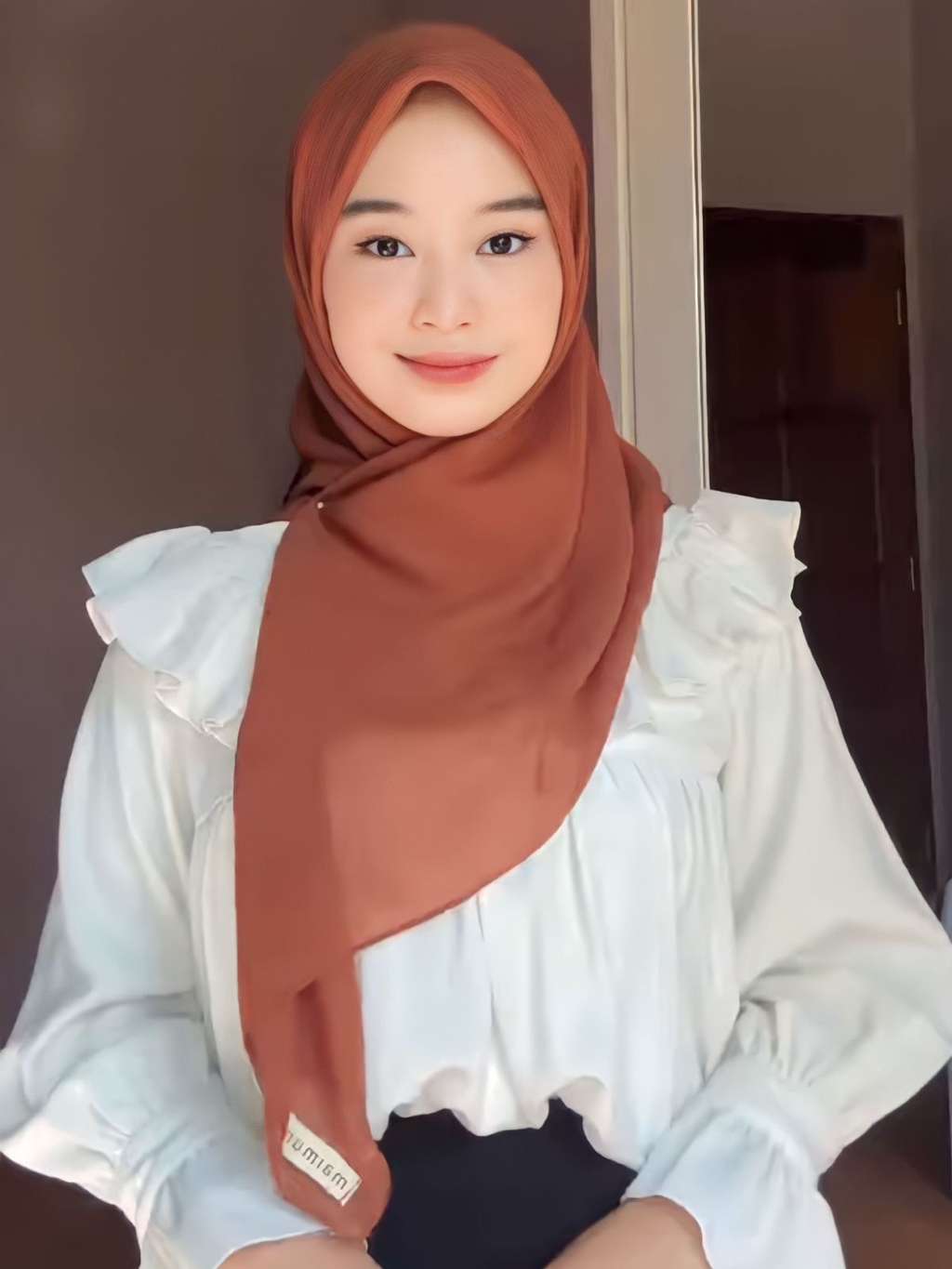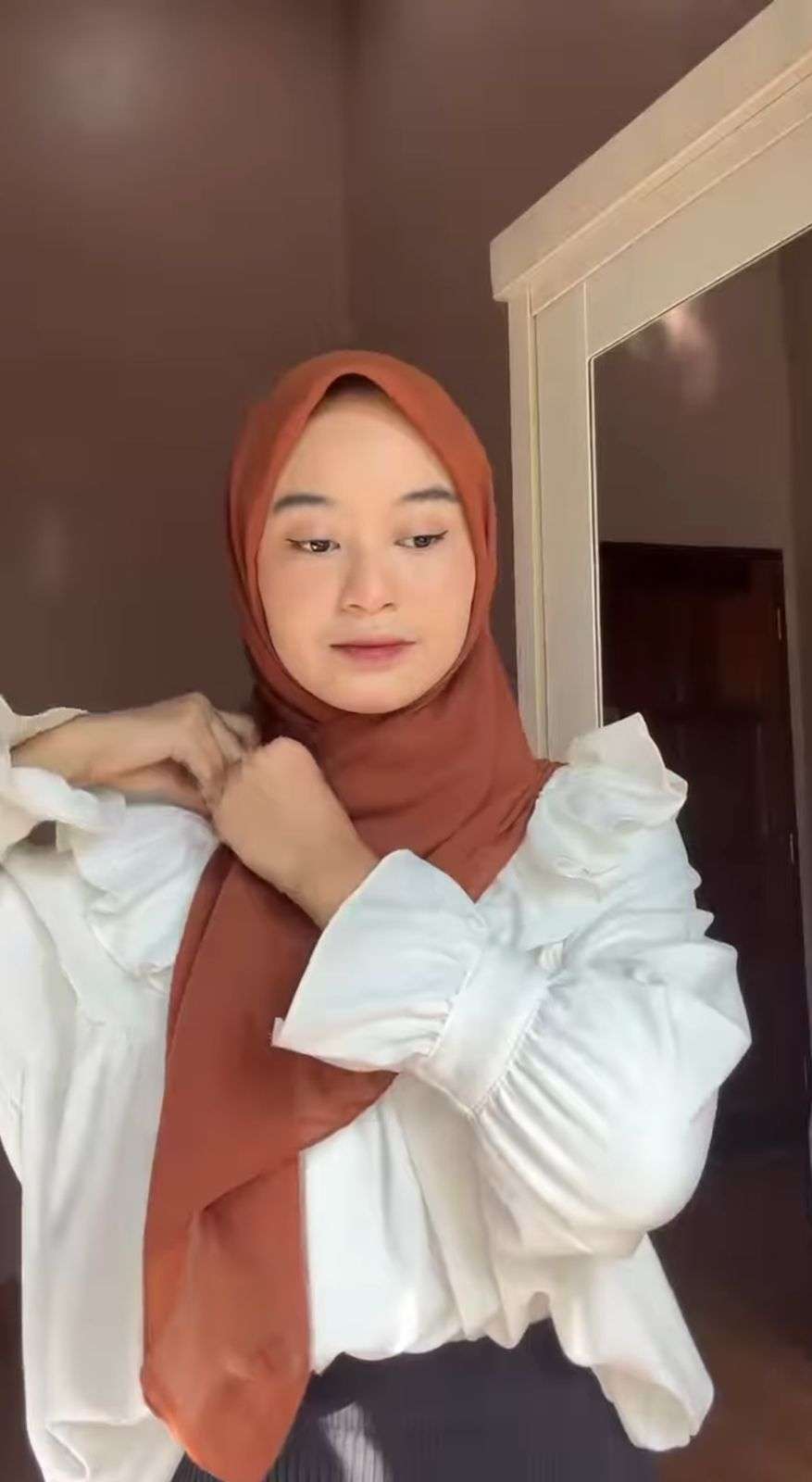 Dalam tutorialnya, Khadziyah pake kerudung voal segi empat warna merah bata. Kerudungnya dikenakan dengan kedua sisi sama panjang di atas kepala, lalu ia kunci bentuknya di wajah dengan jarum pentul.