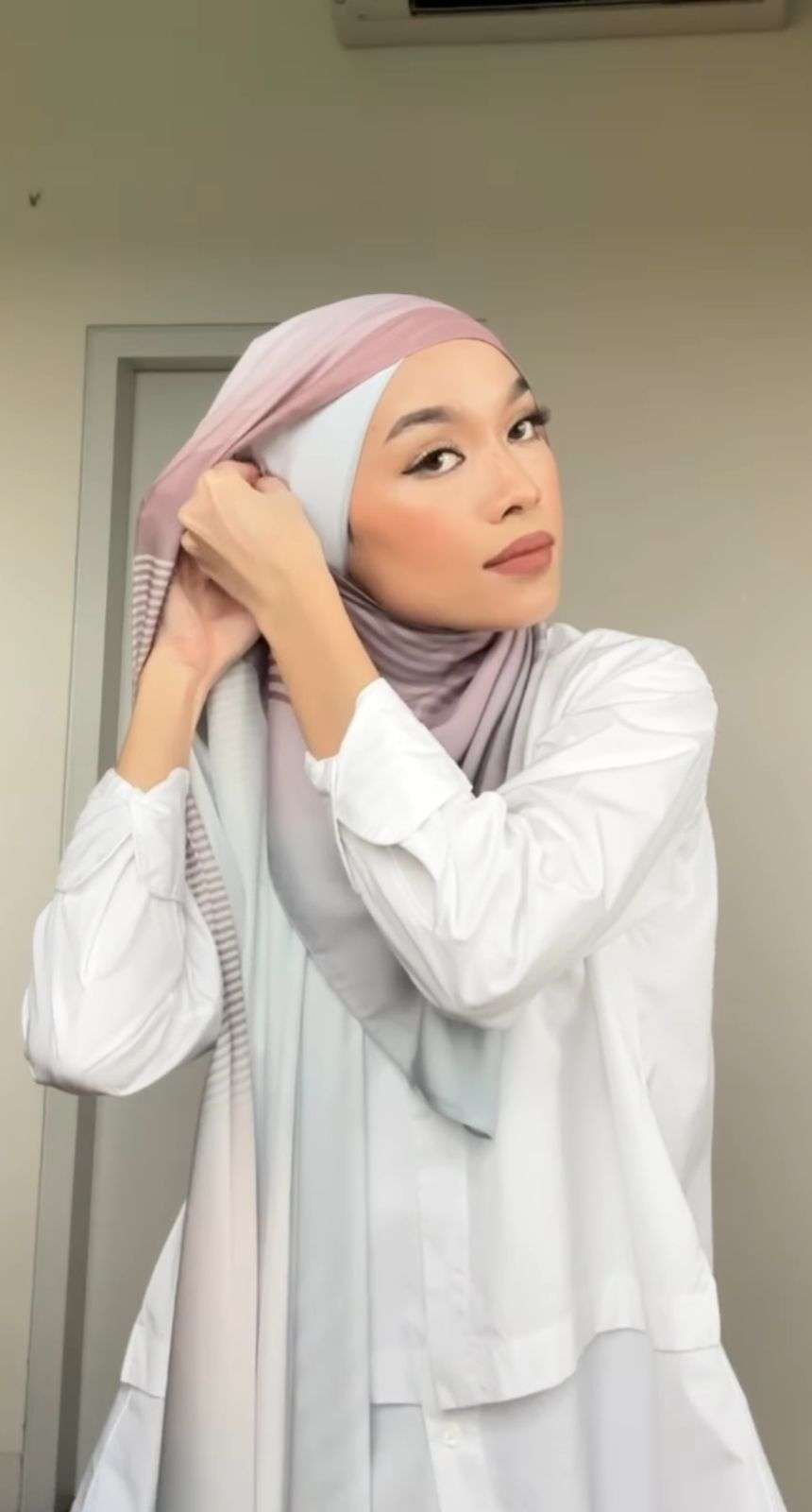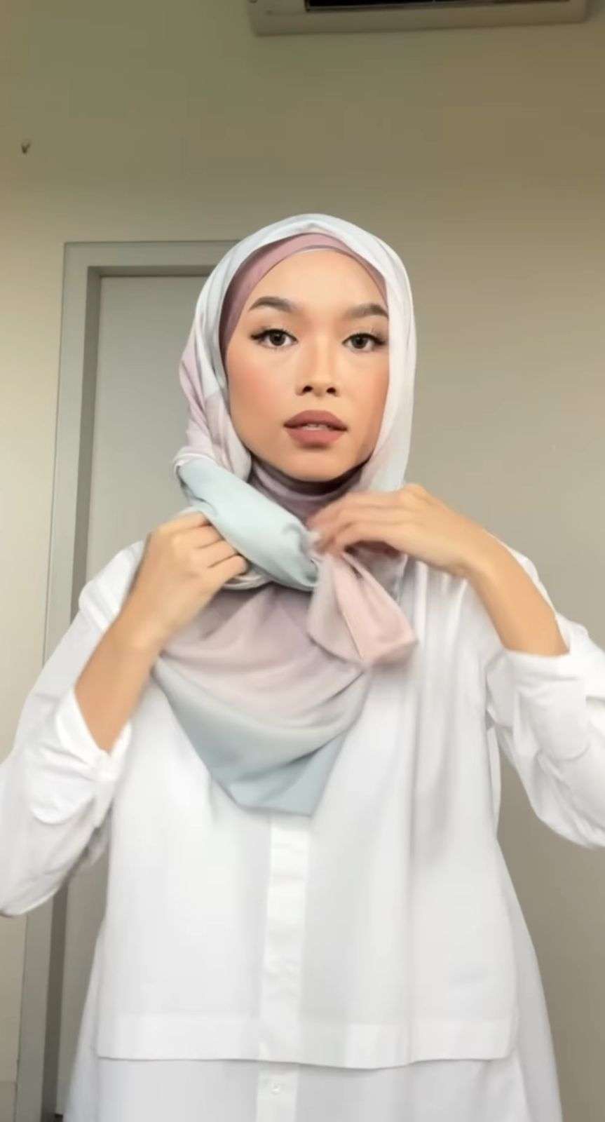 Sisi yang panjang lalu dibawa Sofea untuk dililitkan di atas kepalanya, hingga ujungnya ia selipkan ke bagian lipatan sisi kerudung di depan leher. Baru kemudian dibawa ke bagian belakang tubuhnya.