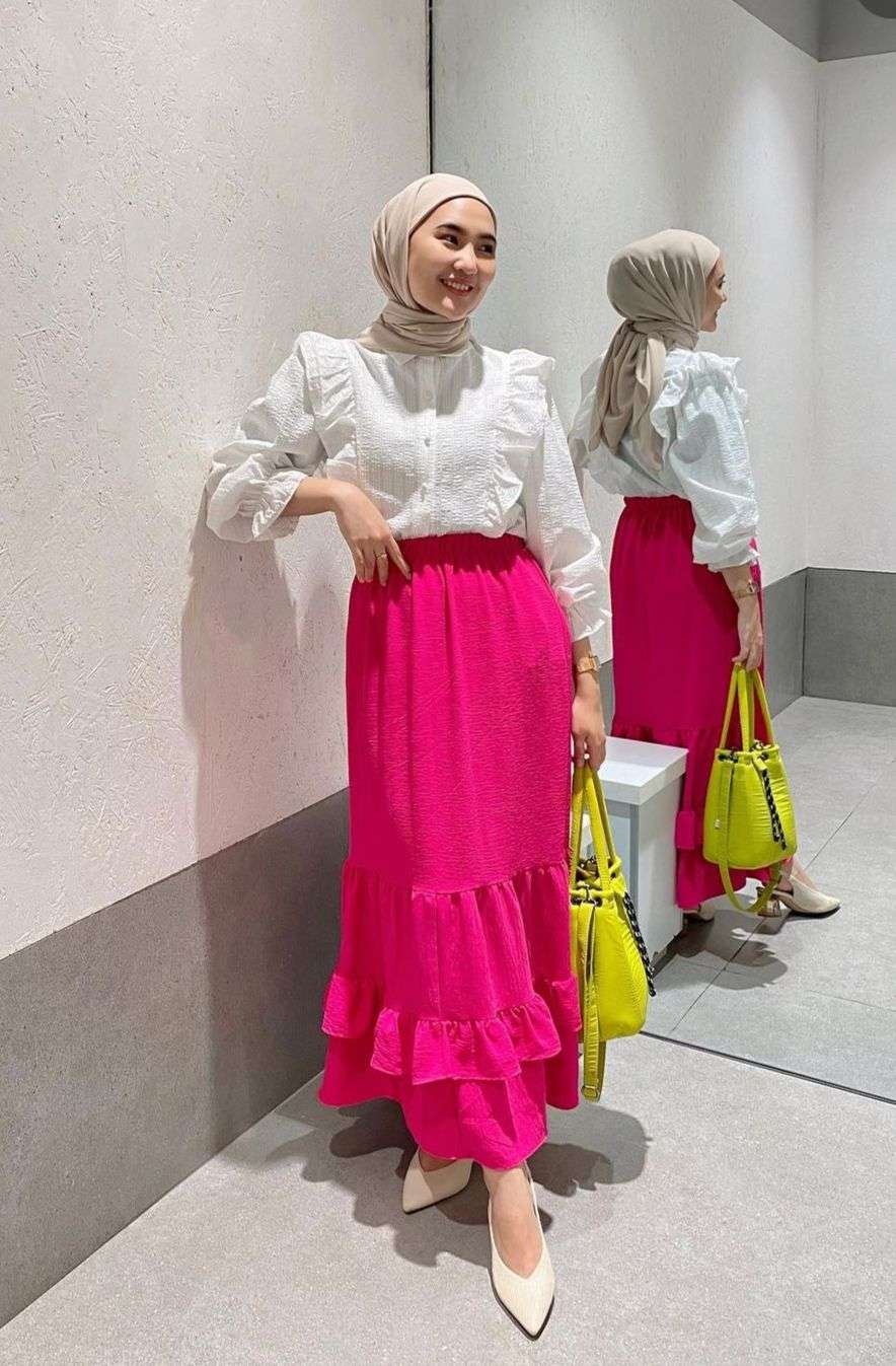 Untuk tampilan lainnya, Intan bermain warna. Ia mengenakan kemeja ruffle warna broken white dengan rok layer pink fushia.