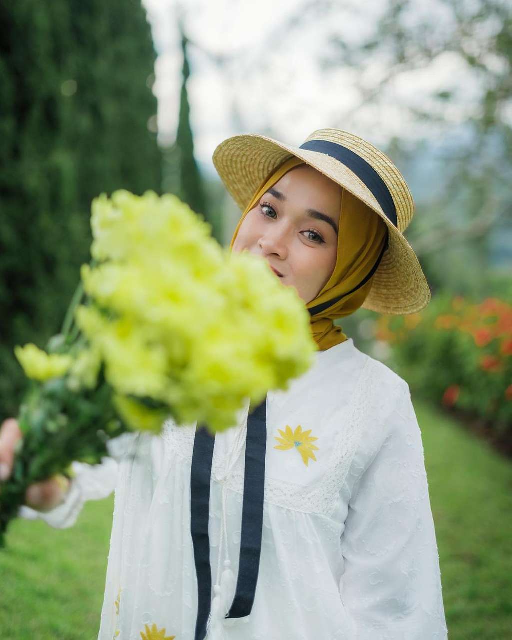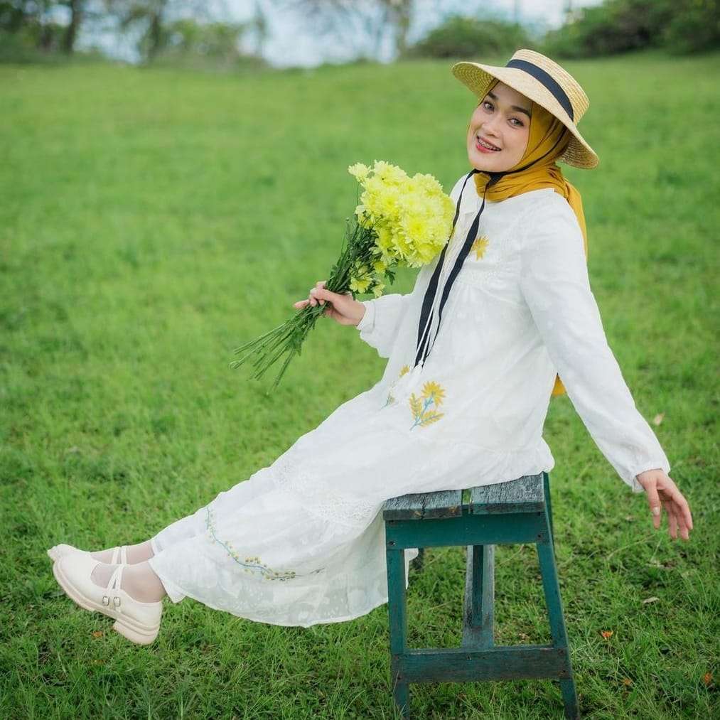 Mengenakan hijab warna mustard, Ririe lalu menambahkannya dengan topi lebar anyaman dengan model klasik. Tali hitam diikatkan di dagunya. Tampilannya seperti outfit piknik dengan nuansa vintage.