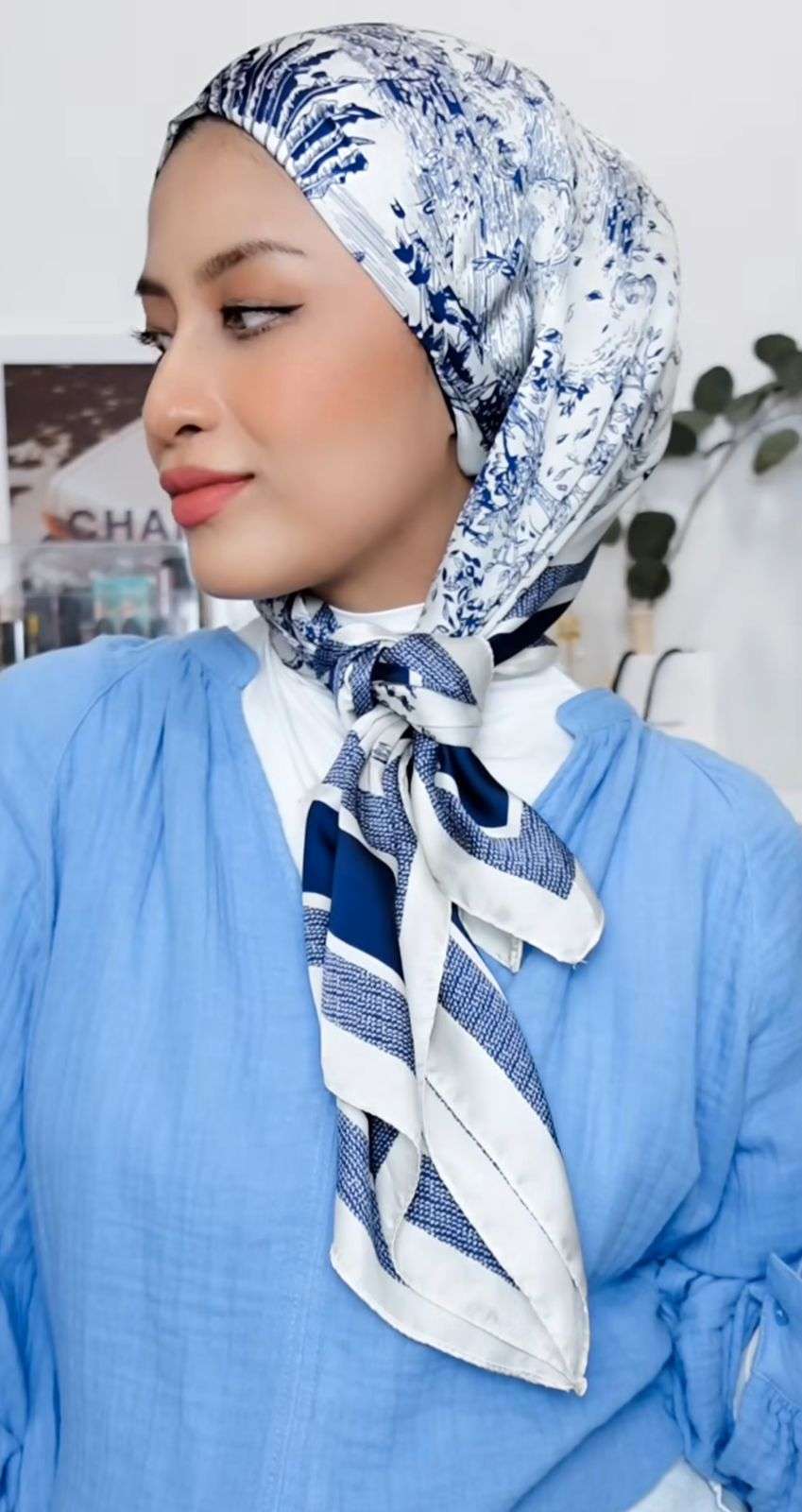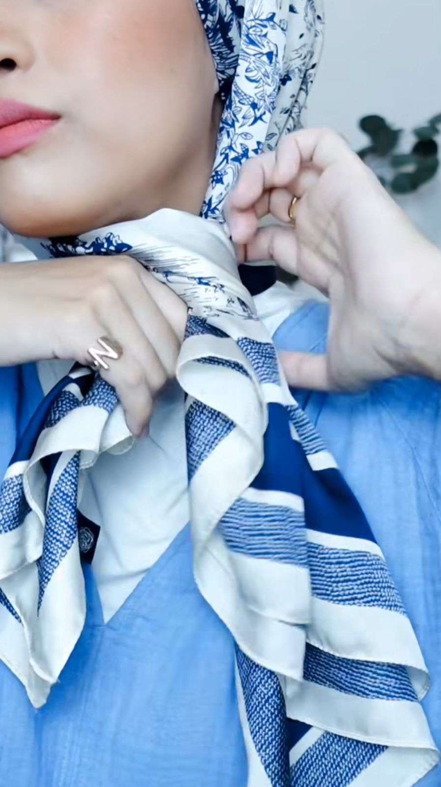 Nadya, content creator asal Malaysia, membagikan cara styling turban menggunakan kerudung segi empat motif. Cocok untuk kamu yang ingin tampil menggunakan outfit polos.