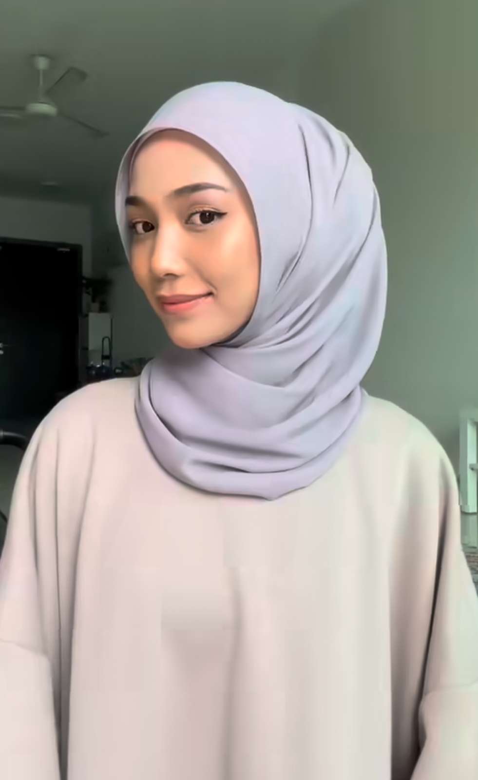 Hanya perlu satu jarum pentul untuk mengunci bentuk kerudung untuk mendapatkan tampilan kerudung yang flowy.