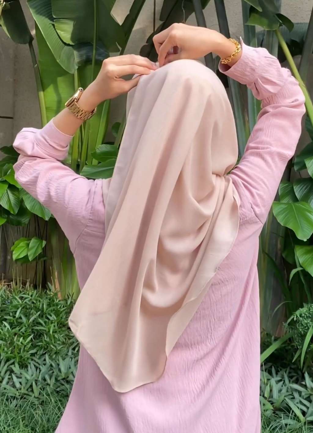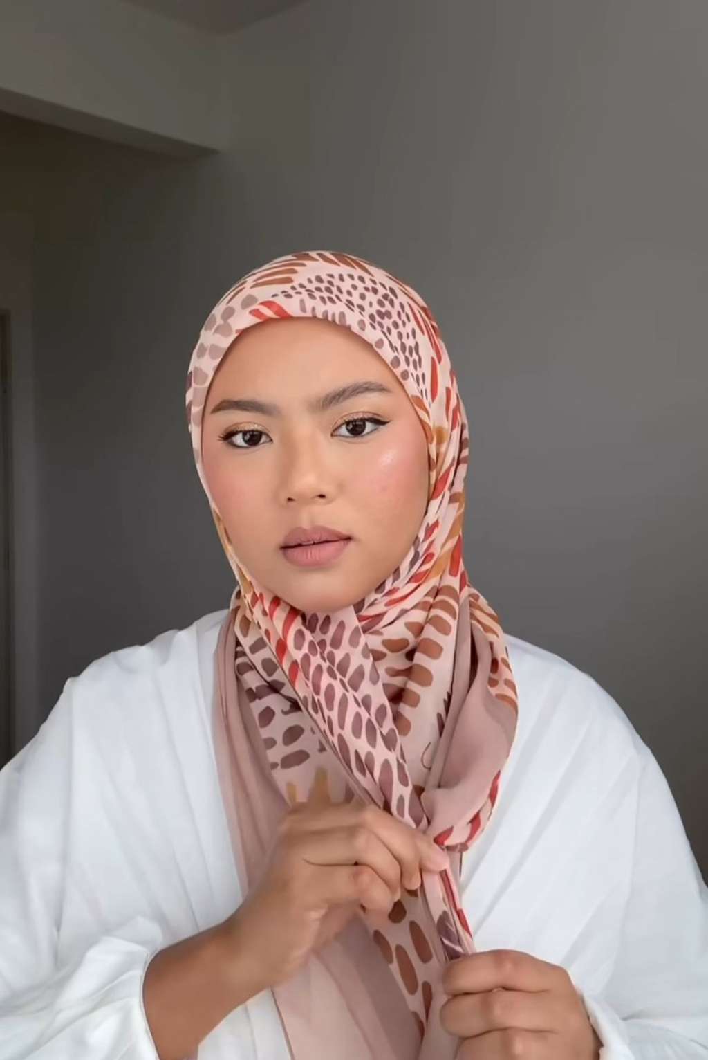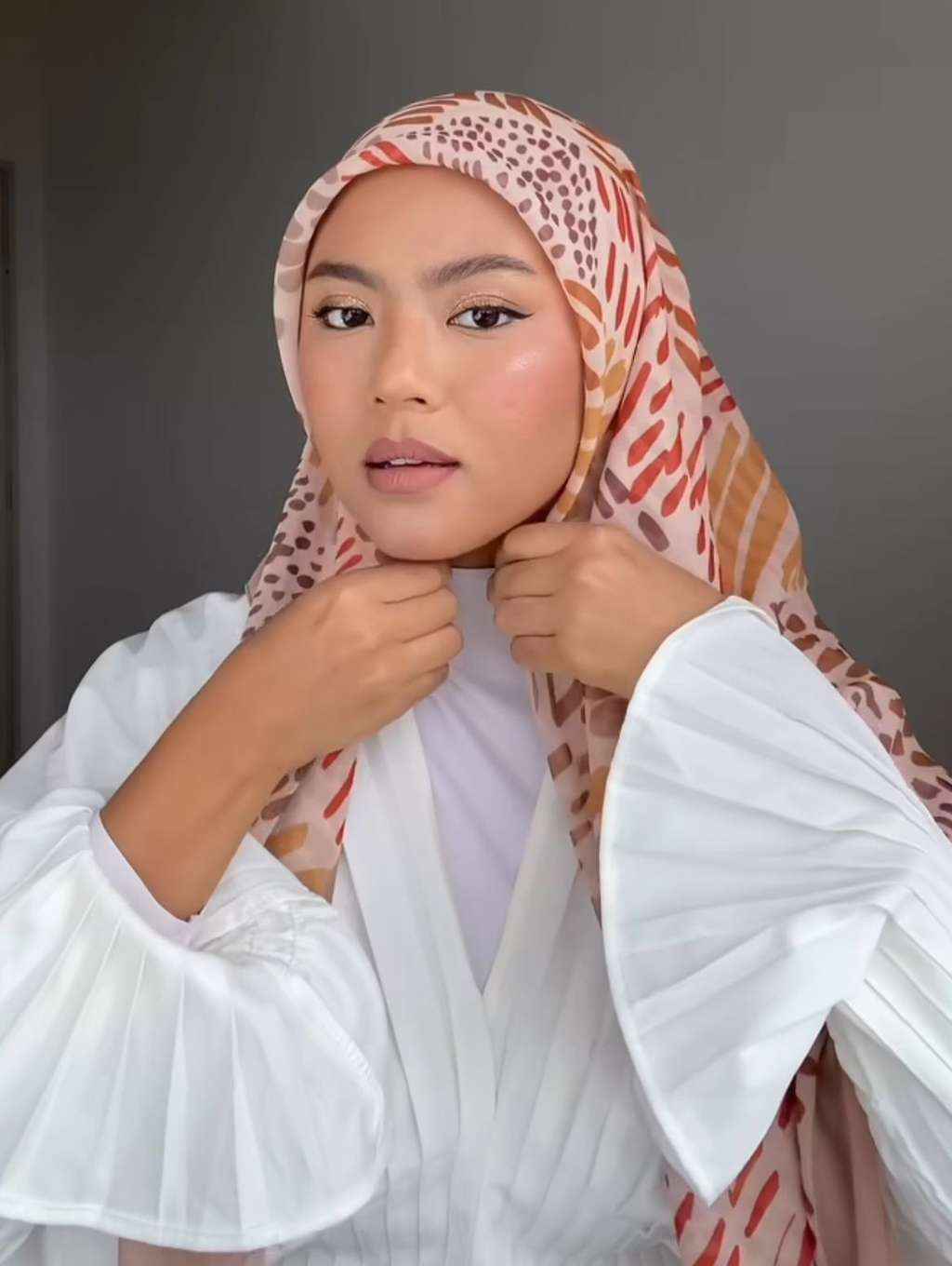 Ia lalu mengambil sisi panjang pada kerudung dan dibawa untuk dililitkan di bagian lehernya melewati sisi yang pendek.