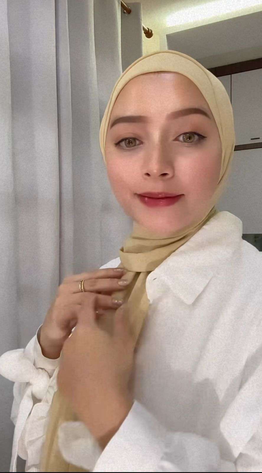Setelah pashmina instannya terpasang di atas kepala, ia buat sedikit lipatan di bagian atasnya untuk kemudian disatukan di bagian bawah dagu. Setelah itu, kedua sisinya dikunci dengan jarum pentul agar membingkai wajahnya dengan rapi.