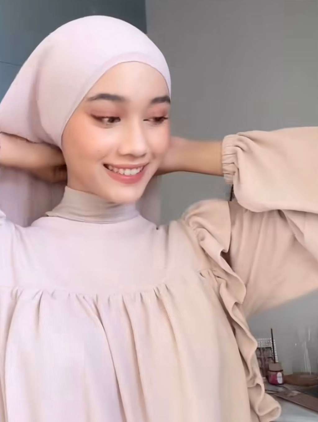 Pertama-tama, Ravira menyiapkan kerudung pashmina warna krem berbahan ceruti. Dia mengenakan herudung itu di atas kepala berciput dengan kedua sisi sama panjang.