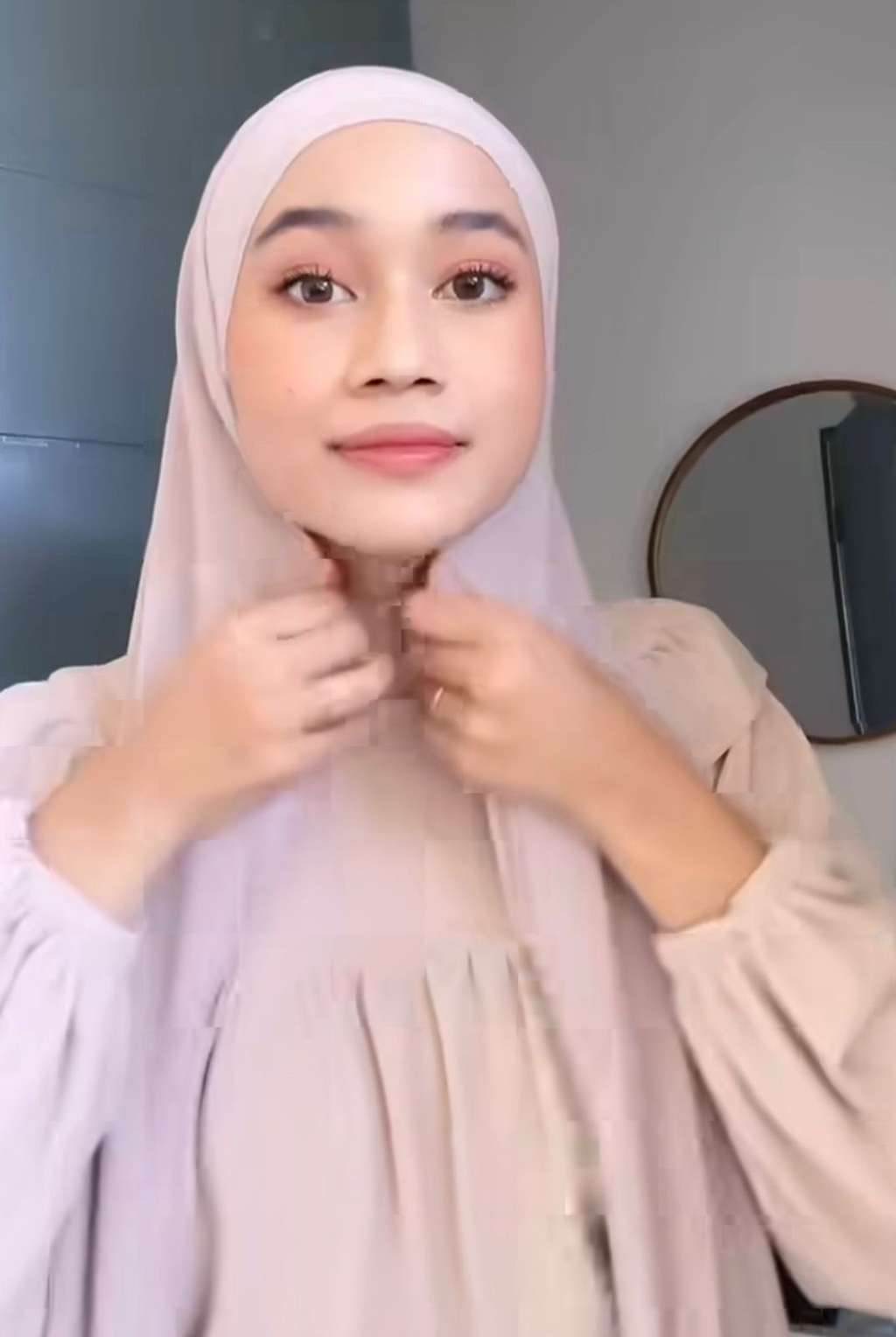 Selanjutnya, Ravira mengangkat bagian belakang kerudung dan membawa kedua sisi kerudung ke bagian belakang leher untuk diikatkan secara simpul dan mengembalikan bagian belakang kerudungnya.