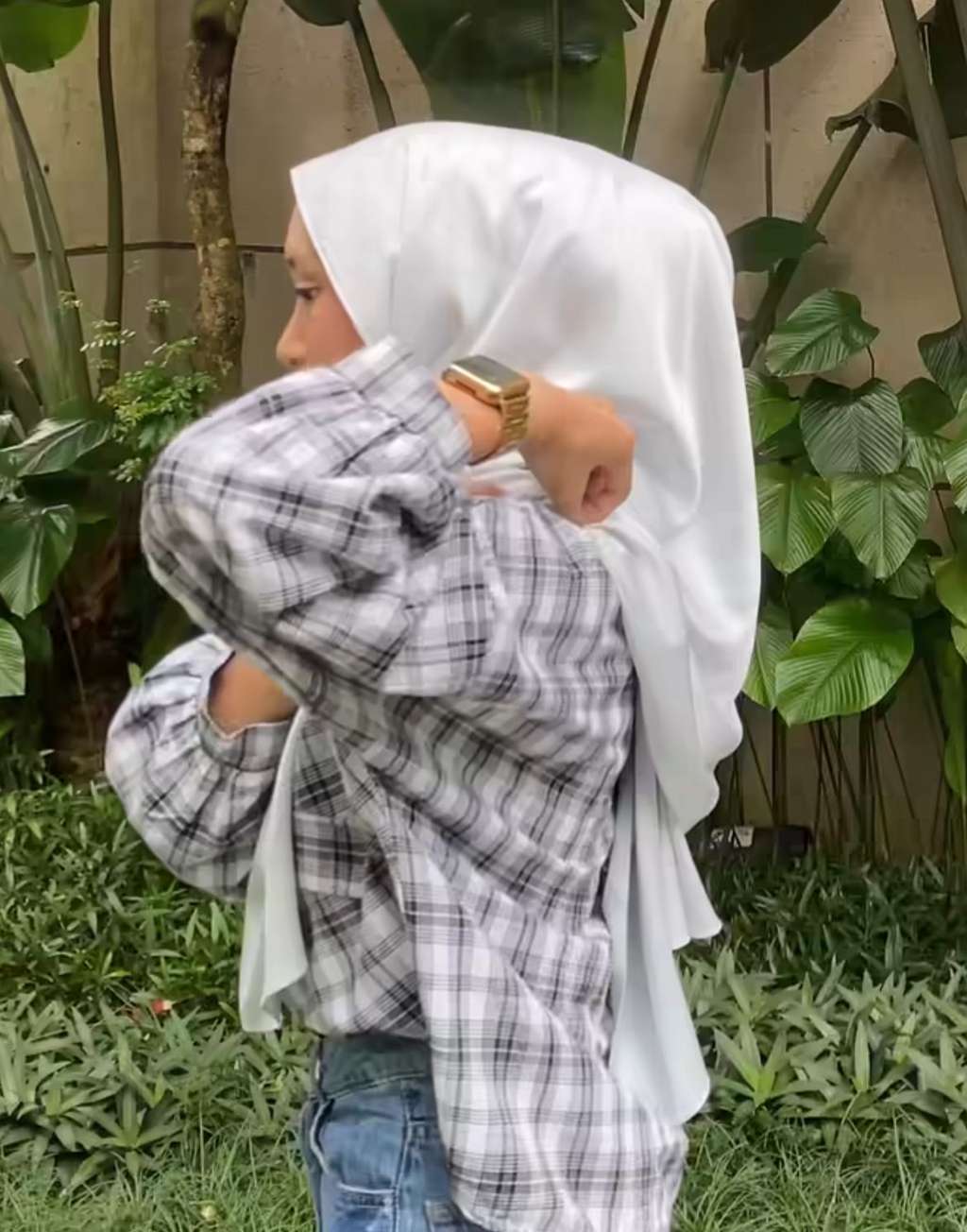 Untuk memastikan kerudungnya lebih rapi, ia juga menyematkan peniti pada bagian bahu agar kedua sisinya tetap secure di bahu.