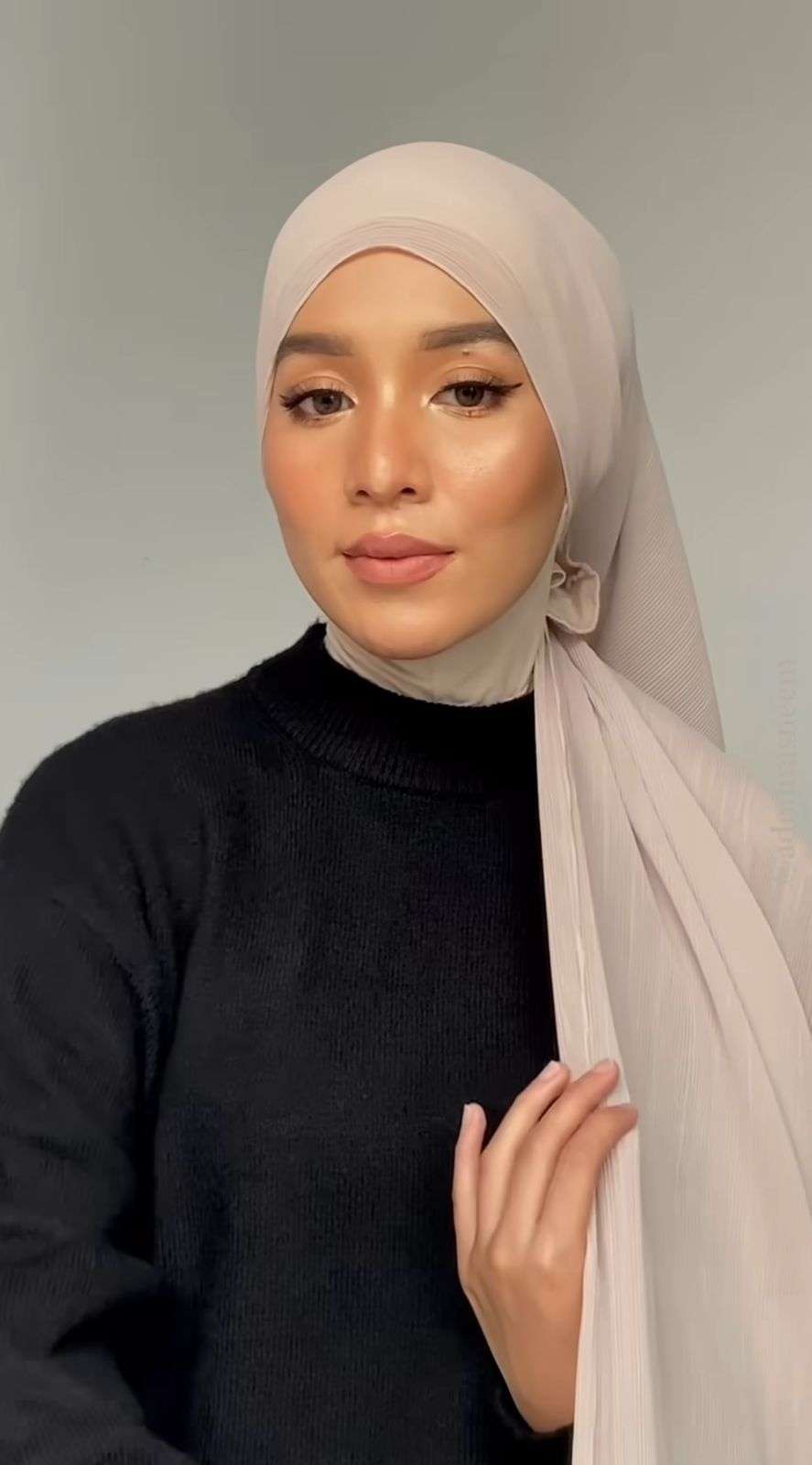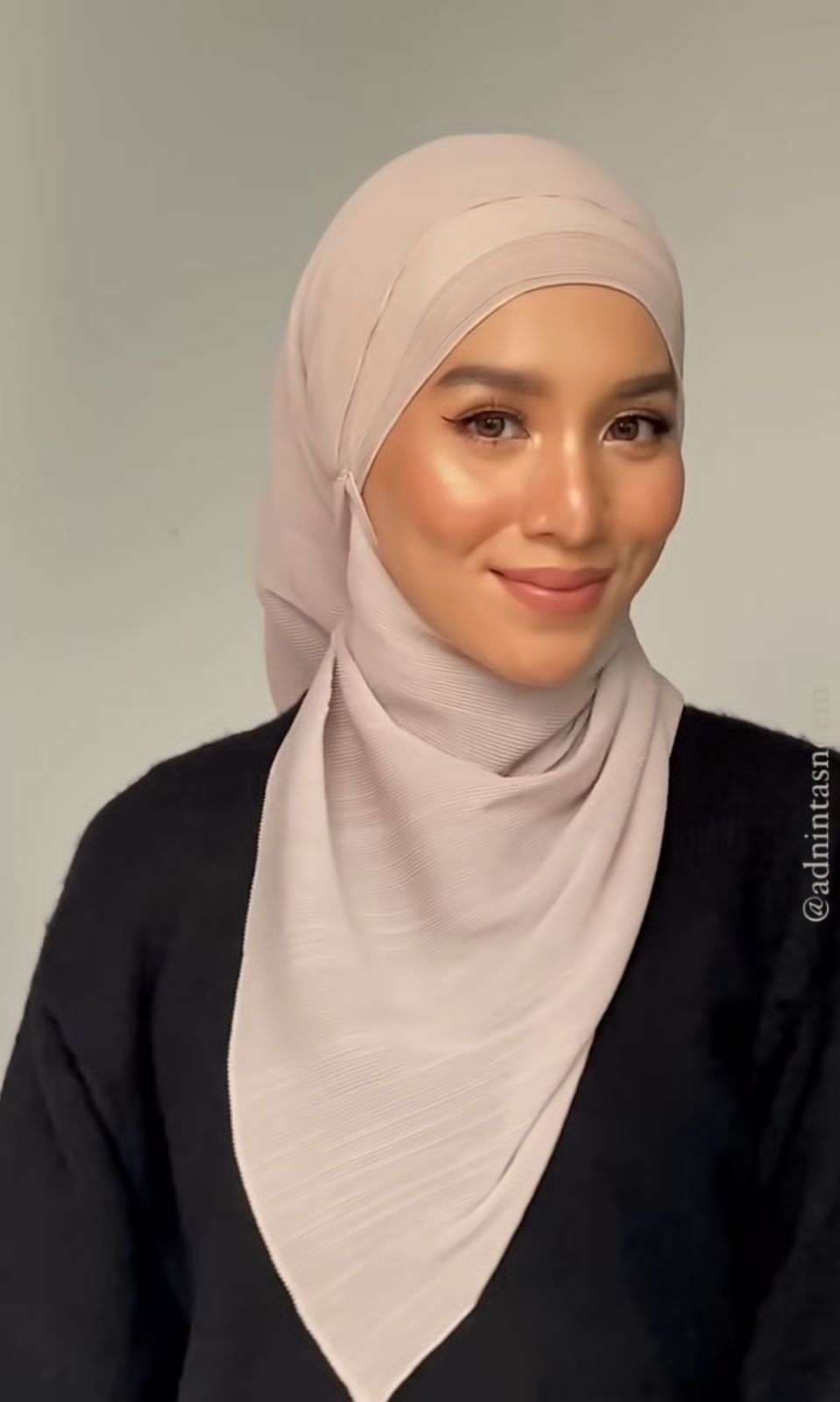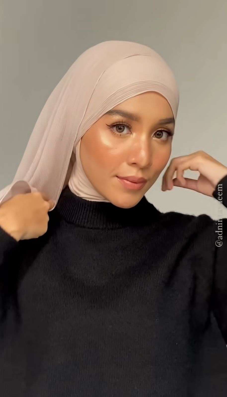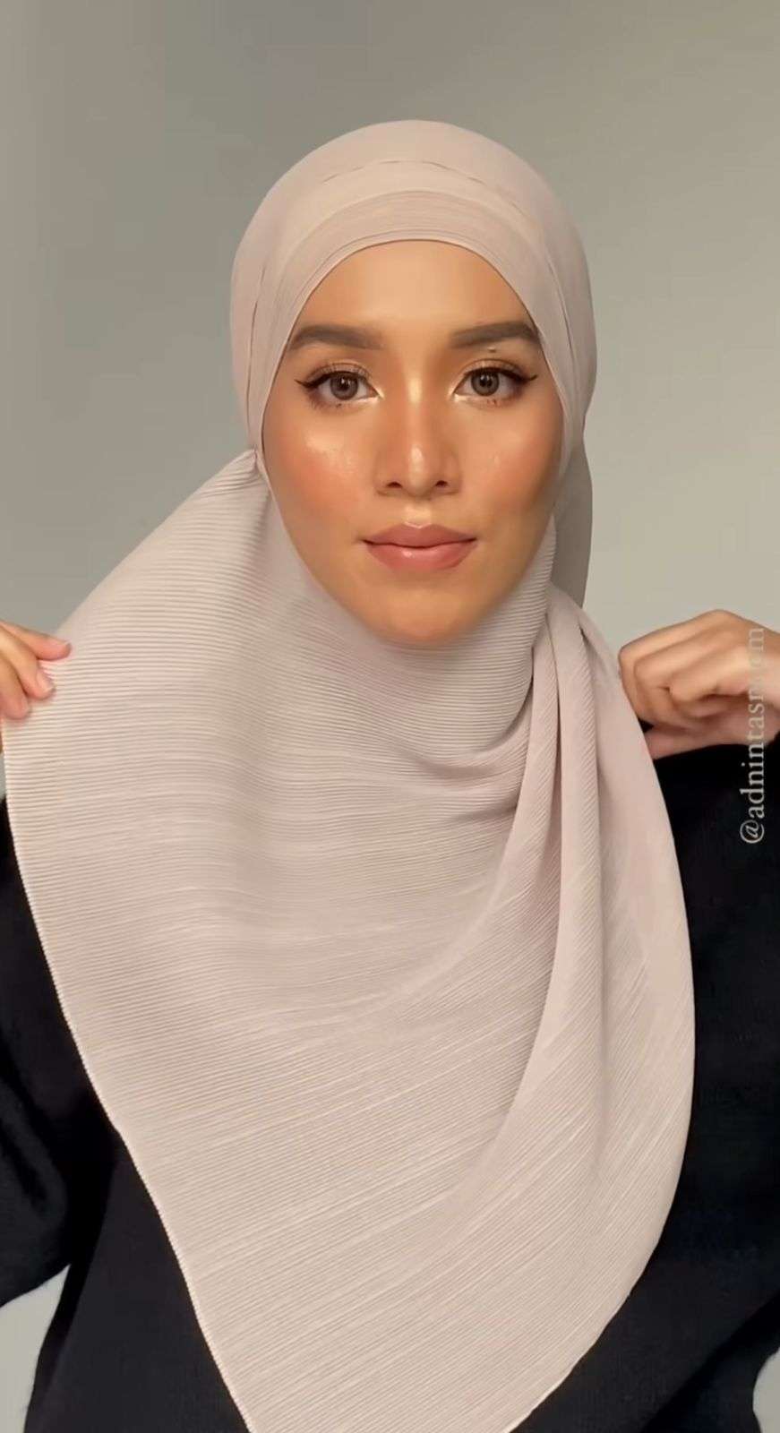 Kita bisa menirukan gaya yang dibagikan oleh model berhijab, Tasneem. Melalui unggahan video pada akun Instagram @adnintasneem, menggunakan pashmina plisket berwarna krem sebagai turban.