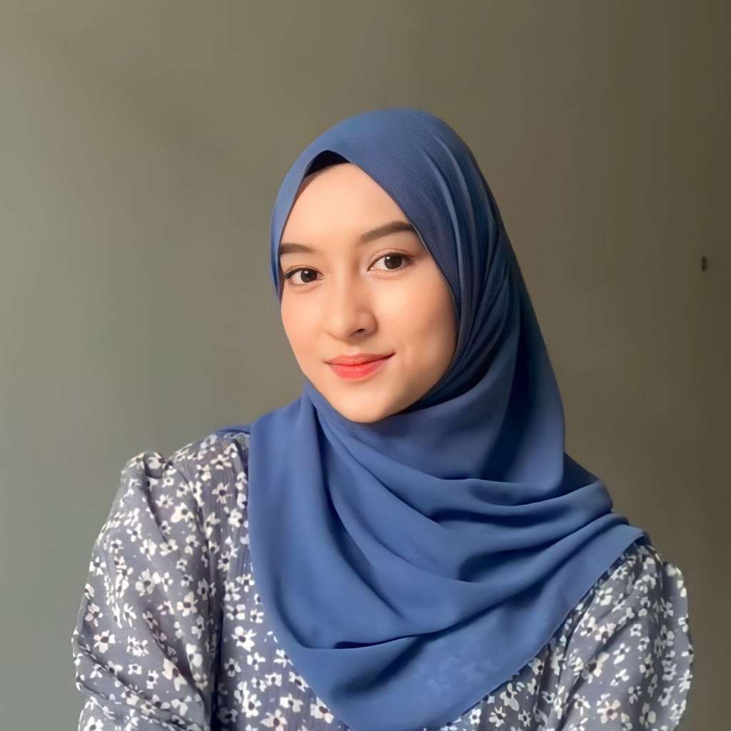 Pertama, hijab yang sudah dilipat menjadi bentuk segitiga diletakan di atas kepala dengan kedua sisi sama panjang membingkai wajah.