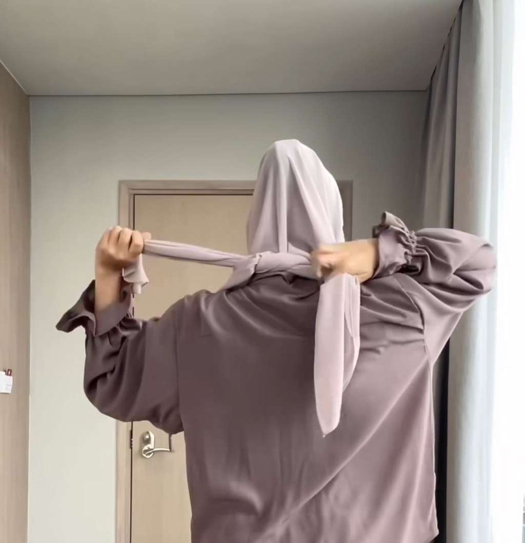 Setelah itu, ia ambil ujung dari sisi kerudung dan dibawa ke bagian belakang. Ujung kerudung lalu diikatkan satu sama lain.