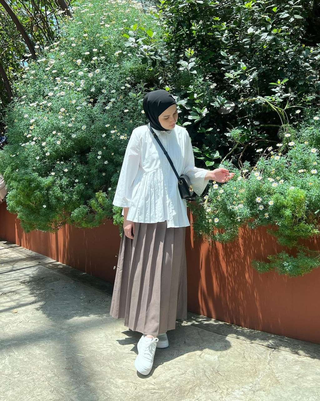 Sneakers putih jadi pilihannya kali ini sebagai alas kaki dan tampak begitu nyaman. Hijab dan tas hitam memberi aksen dan palet warna yang tegas pada look-nya. Perpaduan warna yang menarik, ya.