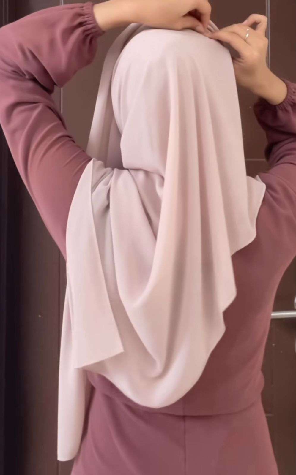 Pertama, kerudung pashmina dikenakan di atas kepalanya dengan salah satu sisi lebih panjang dari sisi satunya. Tak langsung digunakan untuk membingkai wajah, ia membuat sebuah lipatan di bagian atas kepalanya dulu. Baru kemudian disatukan dengan jarum pentul di dagu.