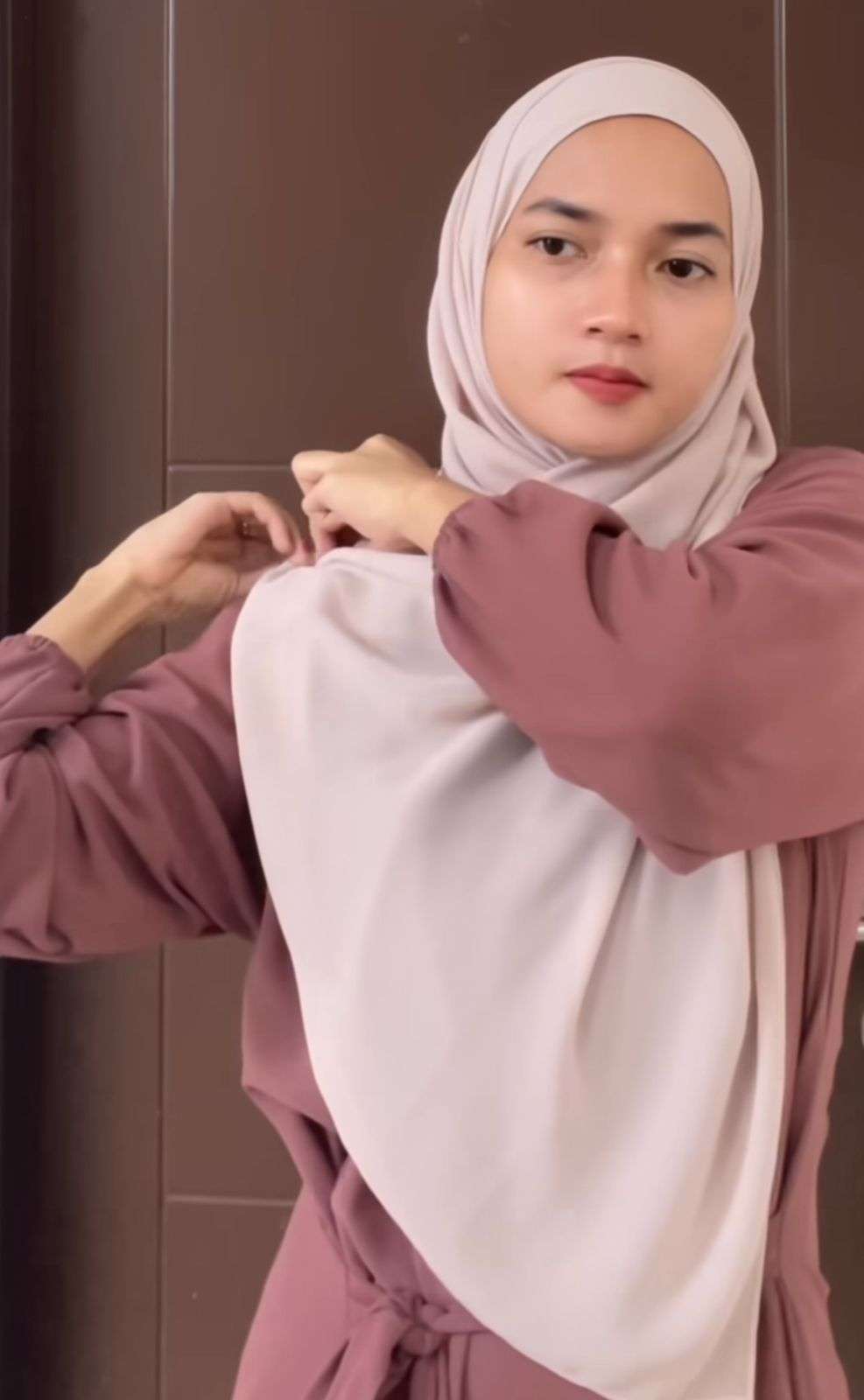 Selanjutnya, untuk bagian belakang kerudung diangkat oleh Nila. Ia bawa sisi kerudung yang panjang, lalu melilitkannya di bagian cepol.