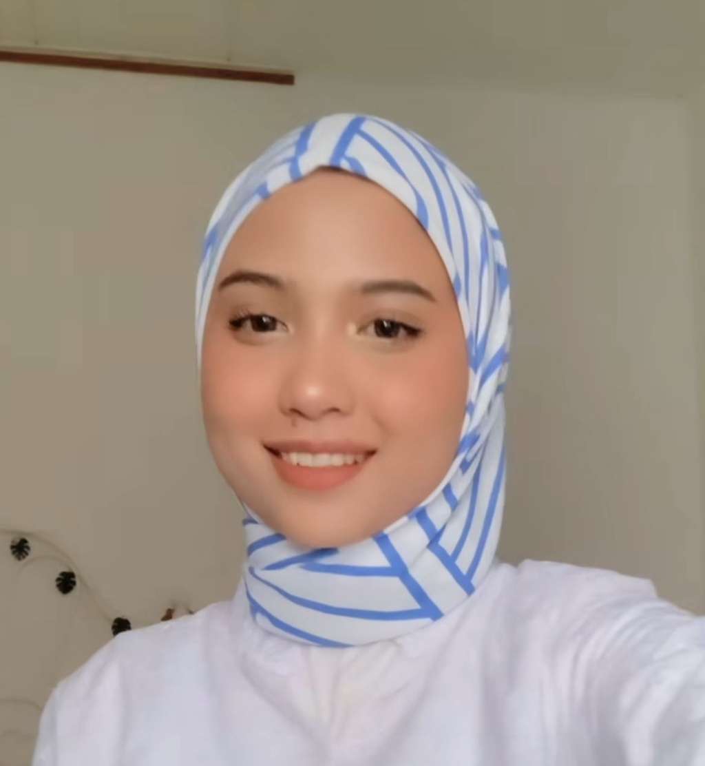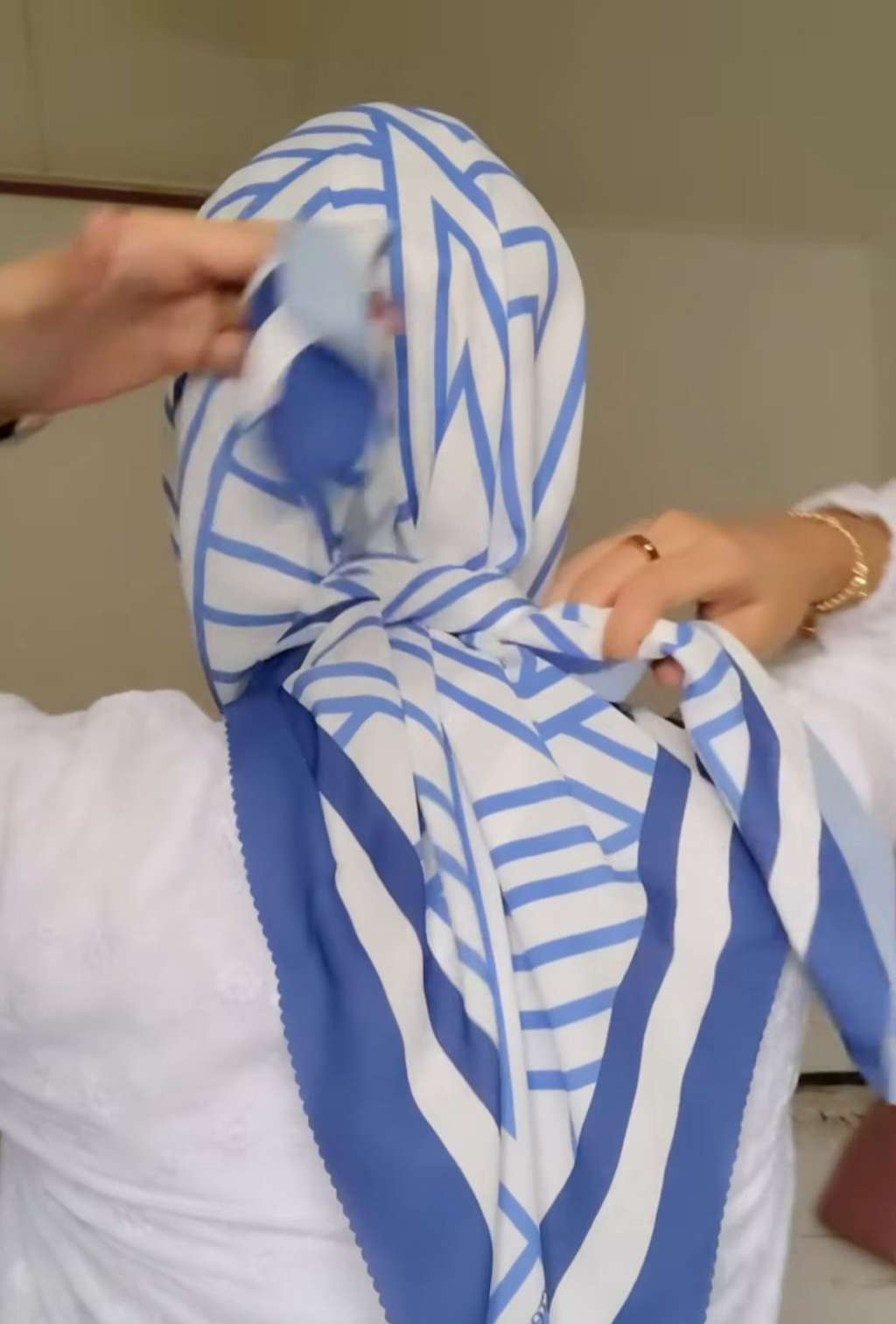 Pertama-tama kerudung motif berwarna biru-putih dipasangkan dengan kedua sisi sama panjang di wajahnya. Ia membingkai wajahnya dengan rapi sebelum mengunci kerudung tersebut.