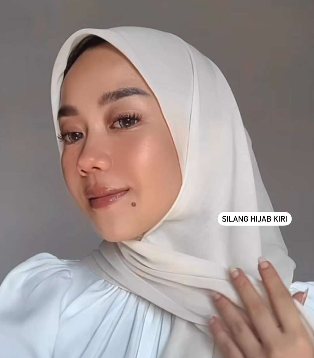 Setelah itu, karena Cherryl punya angle favorit sebelah kanan ia menyilangkan kerudungnya ke arah kiri, sehingga tampilannya terlihat lebih rapi.