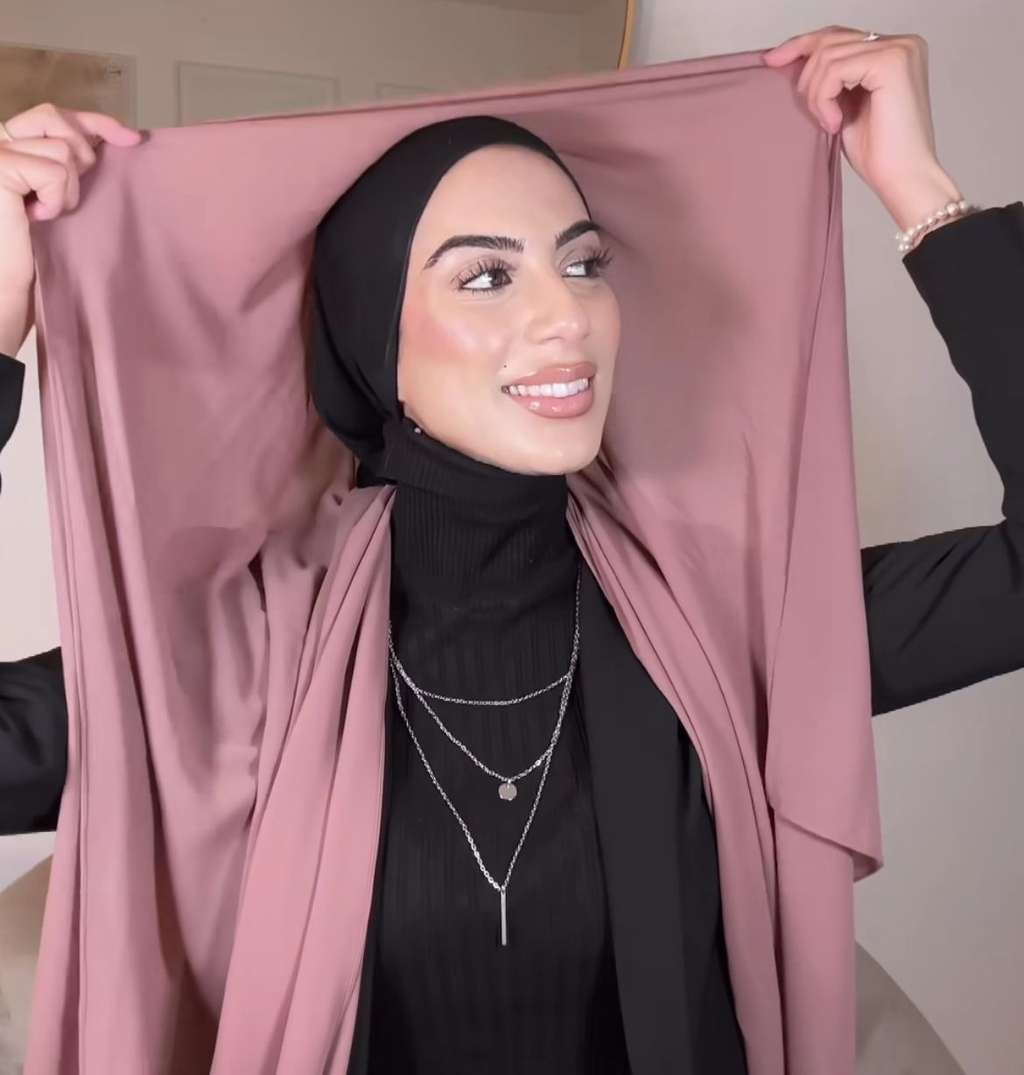 Dalam tutorialnya, ia mengenakan lebih dulu pashmina dengan satu sisi lebih panjang dari sisi satunya. Setelah itu, ia bingkai wajah dengan kerudung tersebut, dan dikunci dengan jarum pentul di dagu.