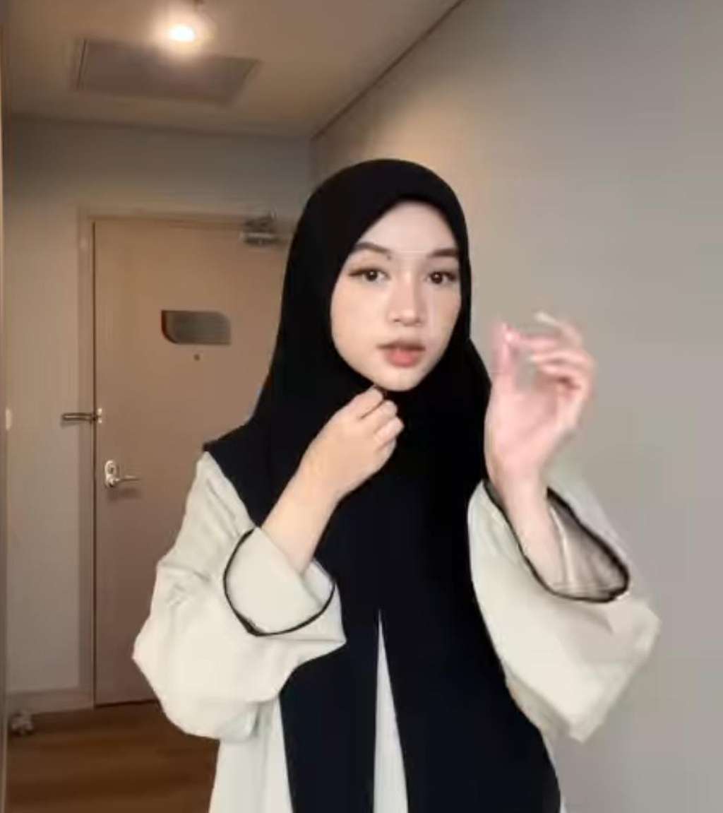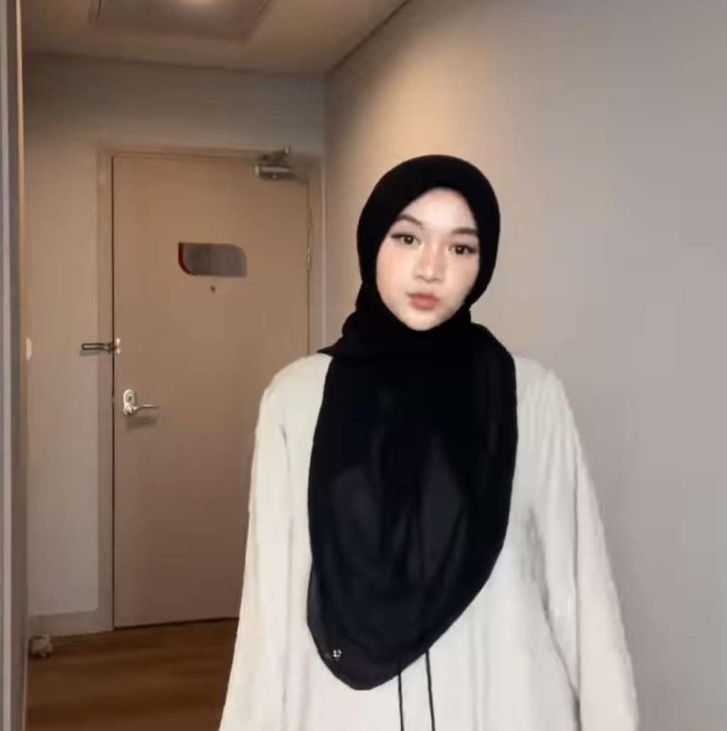 Mutiara mengenakan pashmina yang langsung dipasang di atas kepala. Lalu ia mengambil satu jarum pentul dan membingkai wajahnya dengan pashmina instan tersebut.