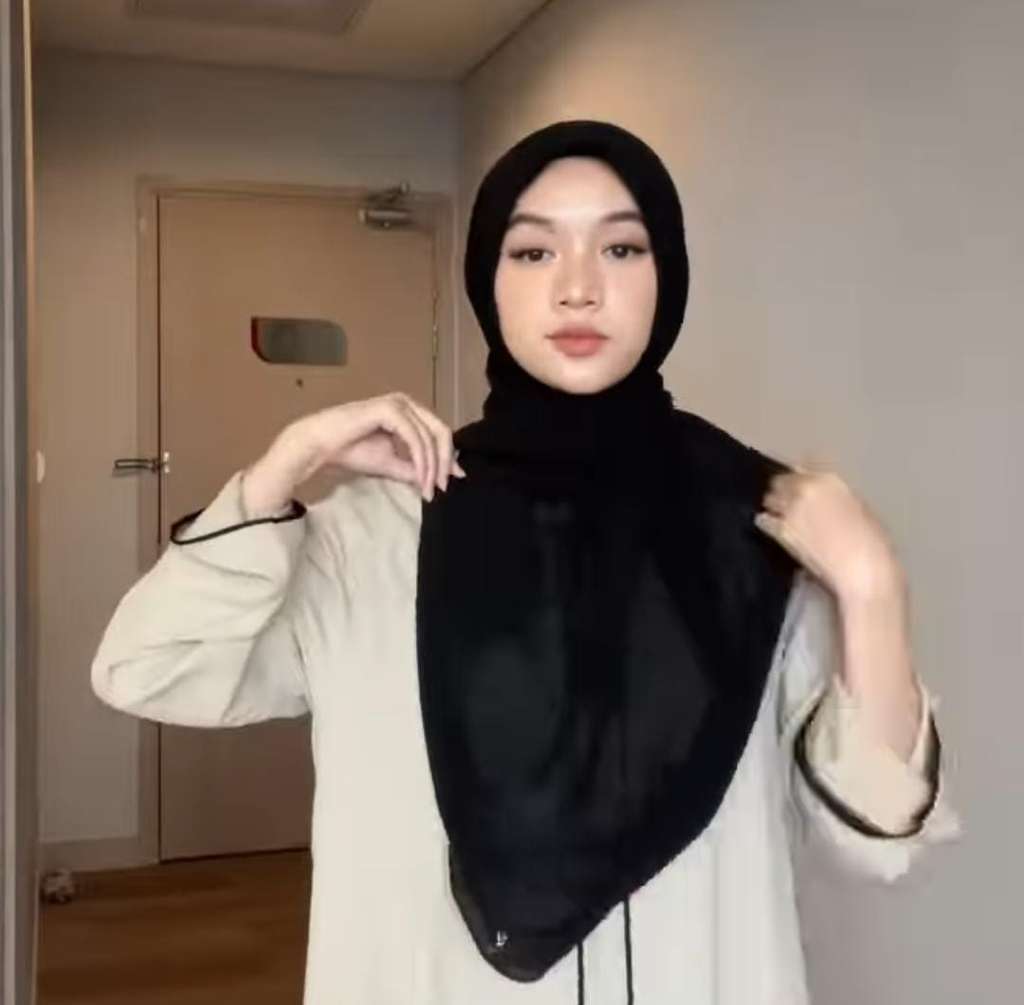 Caranya cukup mudah. Sebagai langkah awal, kerudung segi empat yang sudah dilipat dikenakan di atas kepala dengan kedua sisi sama panjang, dan dikunci dengan jarum pentul pada bagian bawah dagunya.