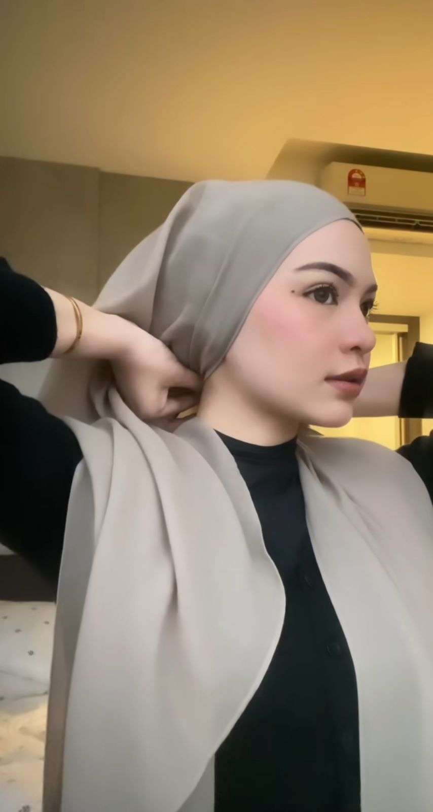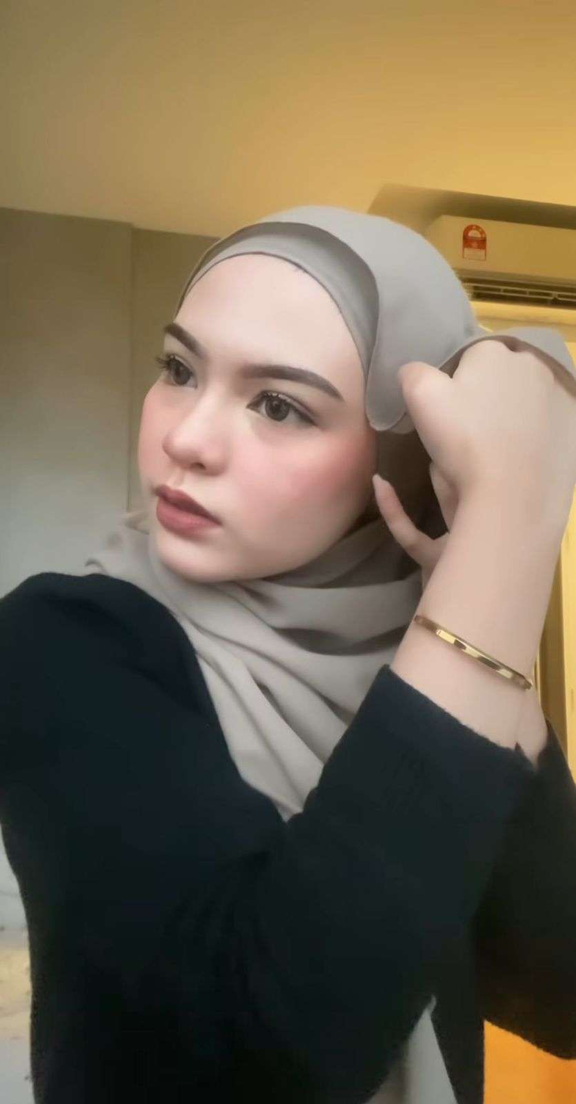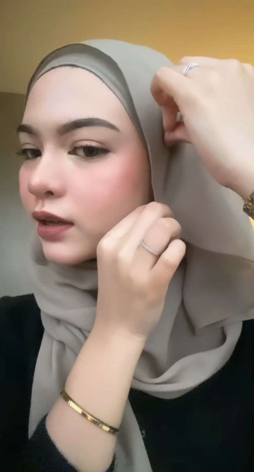 Sebagai langkah awal, dia mengenakan ciput terlebih dahulu di bagian dalam kerudung. Kemudian dia memasang kerudung pashmina di kepala dengan kedua sisi sama panjang.