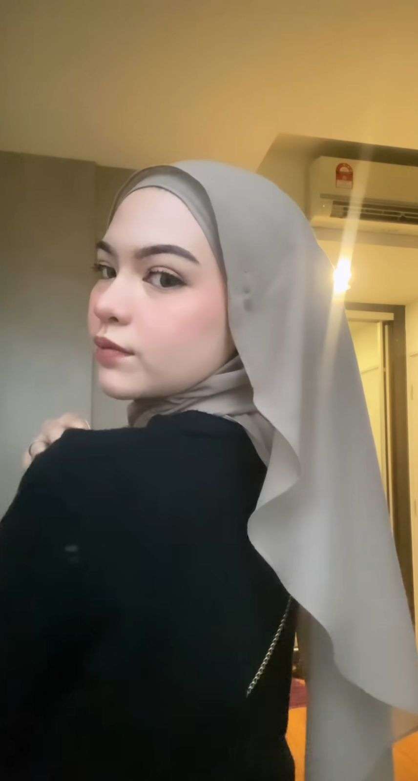 Pada sebuah unggahan di Instagram, Nini menggunakan pashmina katun dengan warna taupe yang membuat wajahnya terlihat lebih cerah.