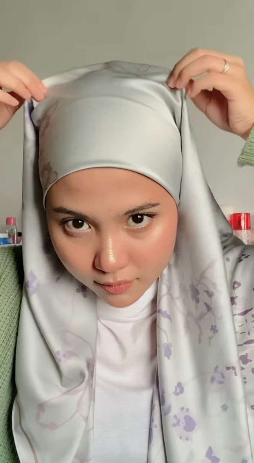 Pertama, kerudung satin segiempat dilipat menjadi segitiga terlebih dahulu. Kemudian diletakkan di atas kepala dengan kedua sisi sama panjang.