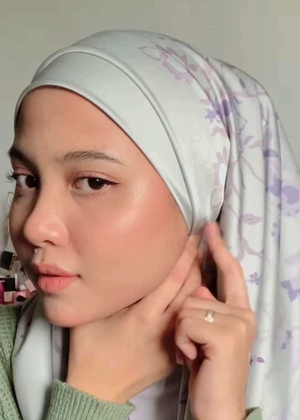 Setelah itu, kita bisa membuat lipatan tepat di atas kepala dan rapikan kedua sisi kerudung membentuk wajah. Sematkan jarum pentul di kedua sisi kerudung yang berada di luar telingga.