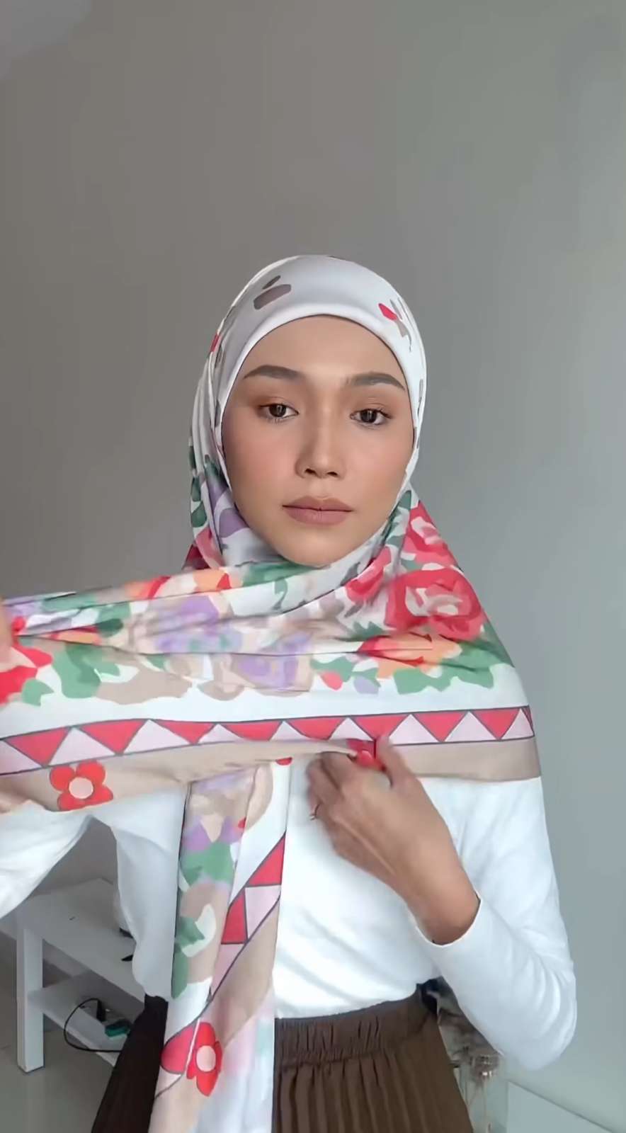 Nasha menggunakan kerudung segitiga motif untuk ide stylingnya kali ini. Dia sudah lebih dulu membingkai wajahnya dengan cara melipat bagian samping kerudung dan disatukan di bagian bawah dagu. Kerudungnya tadi dikenakan dengan kedua sisi yang sama panjang.