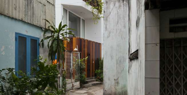 Tampak luar, rumah ini tampak beda dengan pagar kayunya dan bangunan putihnya. Dibangun di atas lahan tidak beraturan dengan lebar 4 m dan panjangnya 8 meter di gang kecil Distrik Phu Nhan, rumah dirancang untuk empat anggota keluarga.