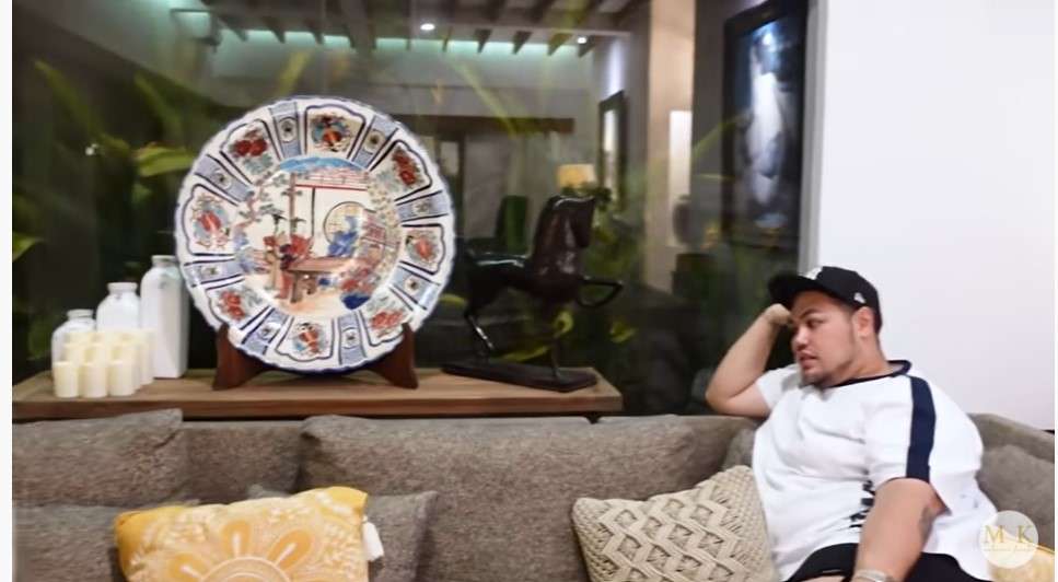 Ruang tamu vila milik Ivan juga sangat luas. Terdapat sebuah sofa besar berwarna abu-abu dan meja yang bagian tengahnya didekorasi dengan hiasan bunga anggrek berwarna putih.
