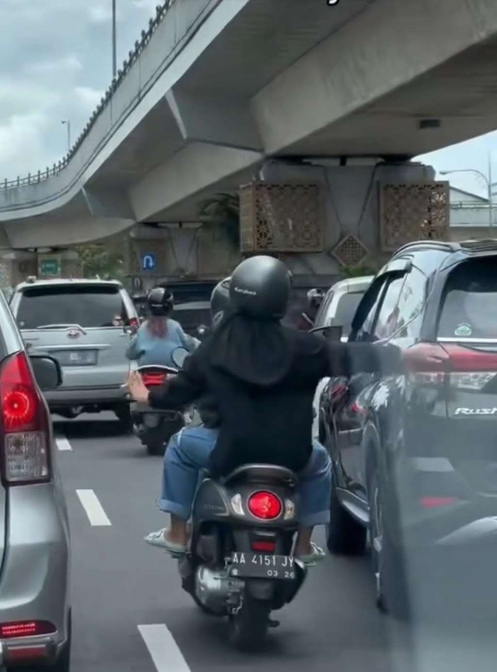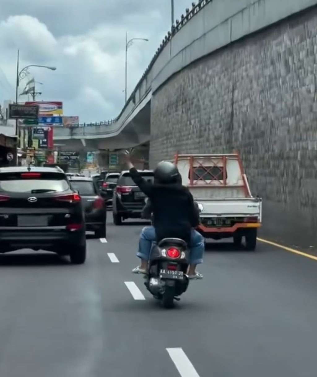 Dengan santai, perempuan jilbab hitam yang duduk di belakang melambaikan tangannya memberi instruksi agar kendaraan di sekitarnya minggir.