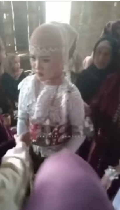 Rekaman lainnnya memperlihatkan dua pengantin wanita itu yang menggunakan pakaian putih menggunakan bawahan tapis dan kerudung putih. Keduanya tampak berdiri dan diminta oleh pihak keluarga untuk saling bersalaman.