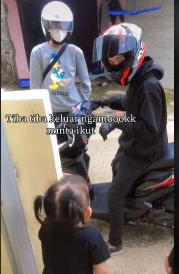 Tak lama berselang, si bocah perempuan itu pun terlihat sudah duduk manis di atas motor. Ia pun diberikan izin untuk mengikuti sang ayah yang akan nongkrong.