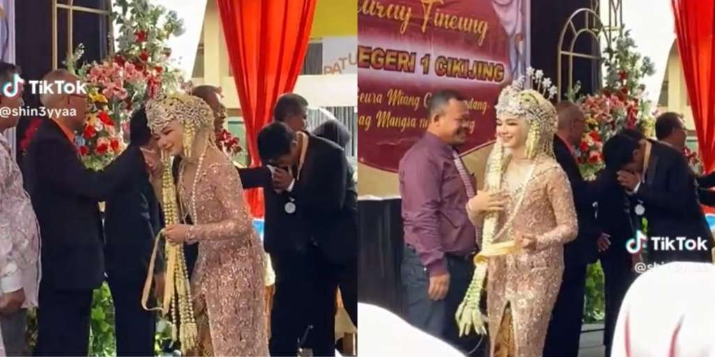 Dalam video yang diunggah akun Tiktok @shin3yyaa, merekam saat seorang siswi yang mengenakan kebaya pengantin itu sedang naik ke panggung untuk bersalaman dengan guru-gurunya.
